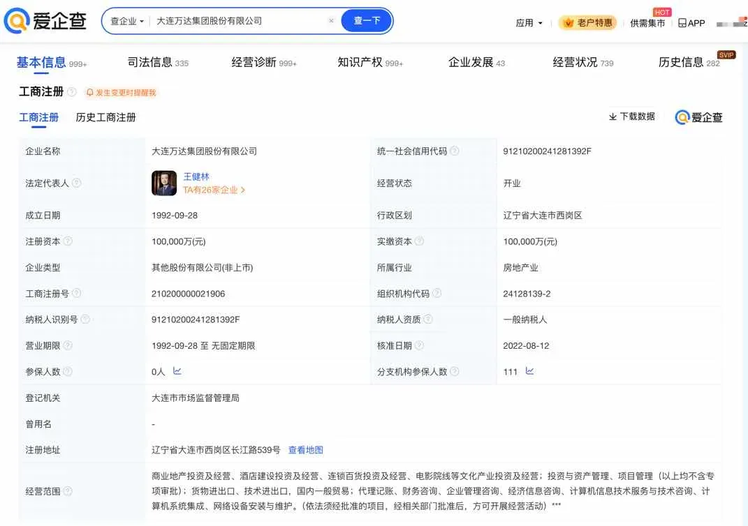 爱企查App显示,大连万达集团股份有限公司成立于1992年9月,法定代表人为王健林,注册资本10亿元人民币,经营范围包括货物进出口、技术进出口、国内一般贸易等。股东信息显示,该公司由大连合兴投资有限公司、王健林共同持股。风险信息显示,该公司现存多条被执行人信息,被执行总金额超53亿元,此外,该公司所持多家公司股权已被冻结。