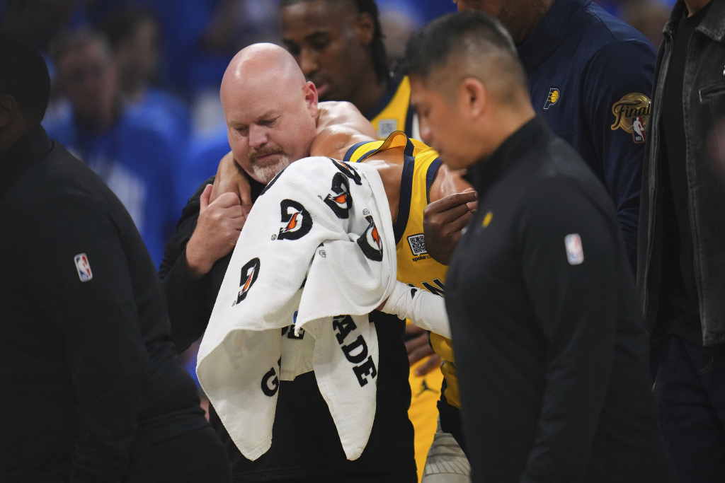哈利伯顿在突破亚历山大过程中,再度拉伤右腿,疑似跟腱重伤。