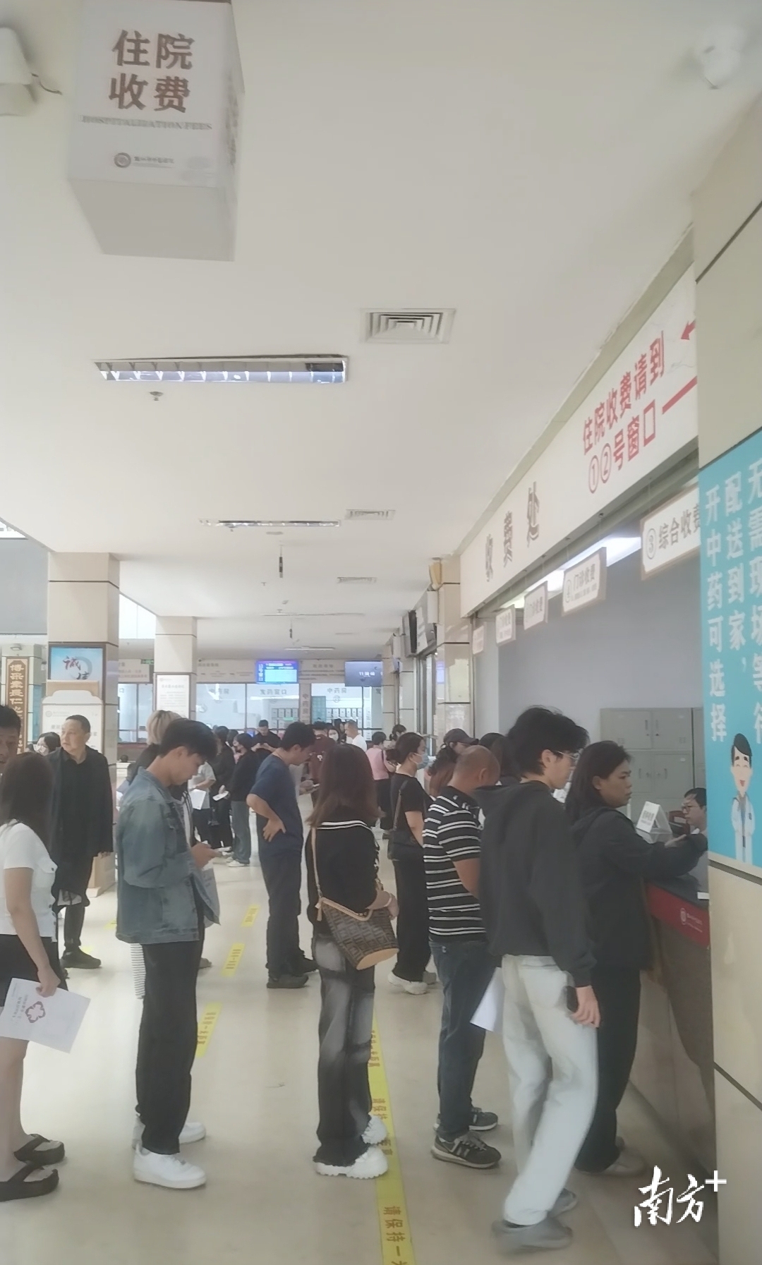 3月22日,周日,上午11时28分,阳江市中医医院门诊楼一楼大厅,收费窗口前排着两排十余人的队伍。12时08分,队伍长度未见缩减。一旁的中、西药房,取药屏幕上的名单不断翻动,未取药患者均超过20人。
