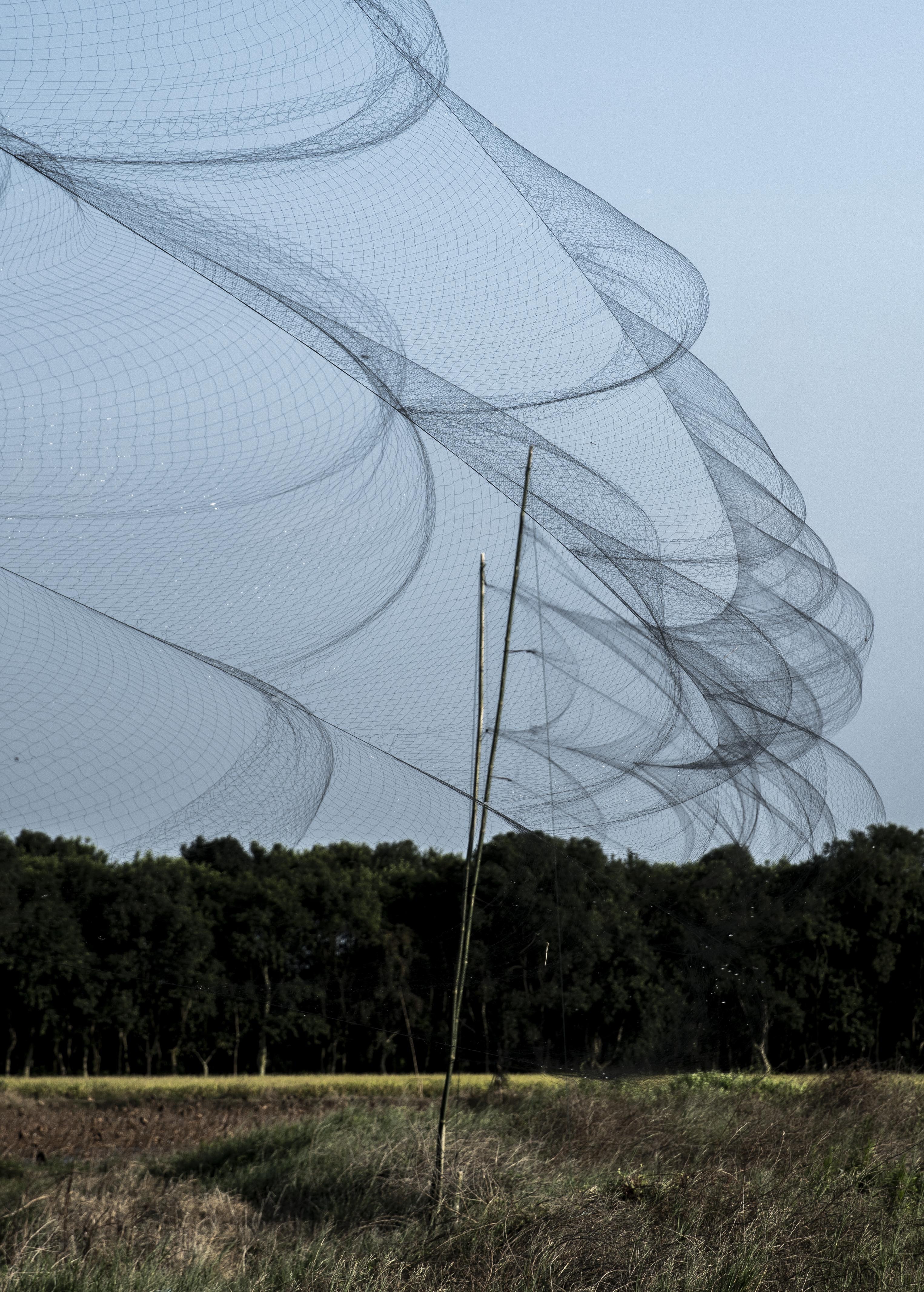 汕尾潭西镇的一处田埂上,捕鸟网遮天蔽日。