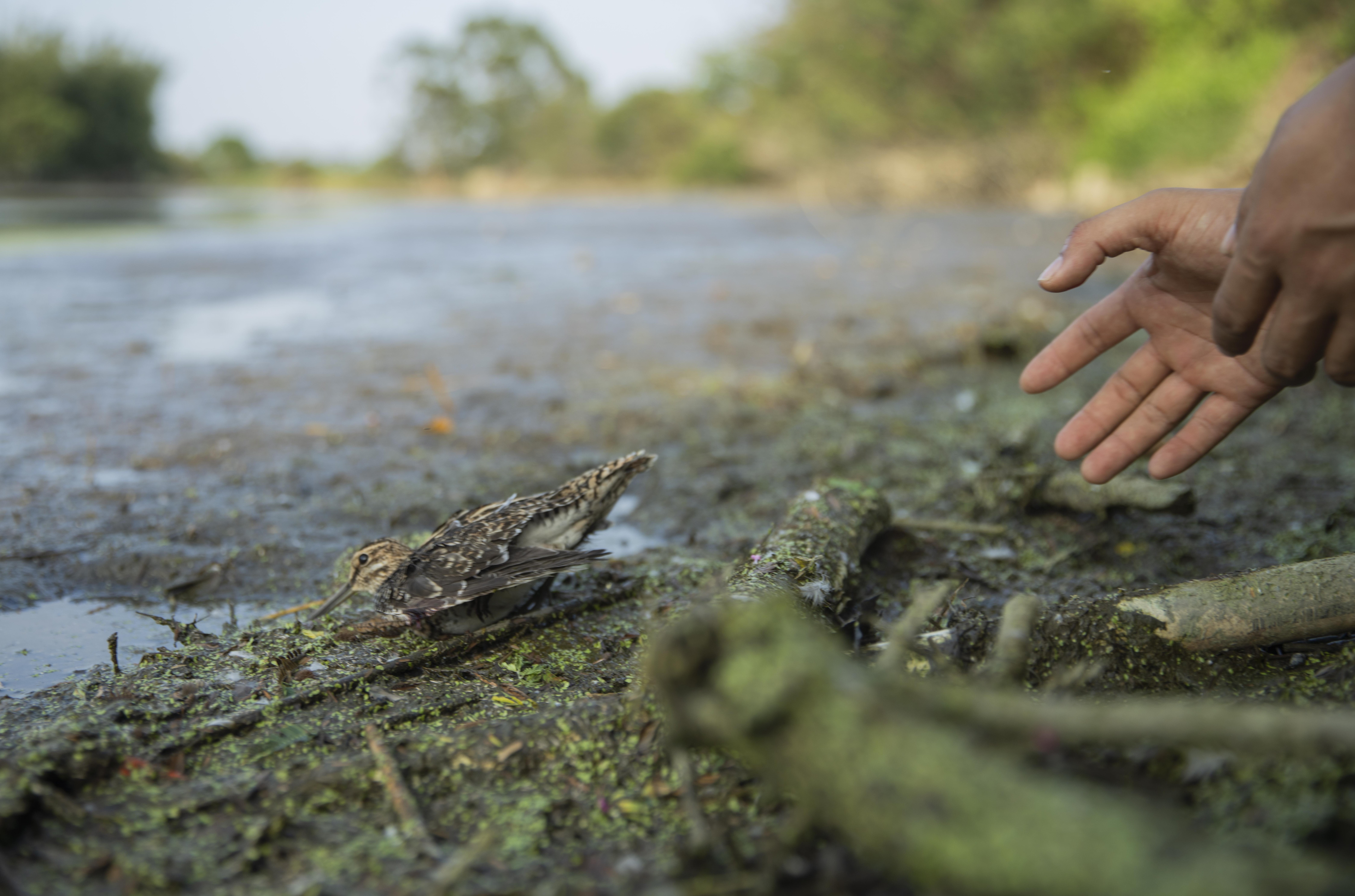11月6日,志愿者解救被鸟网缠住的扇尾沙锥。