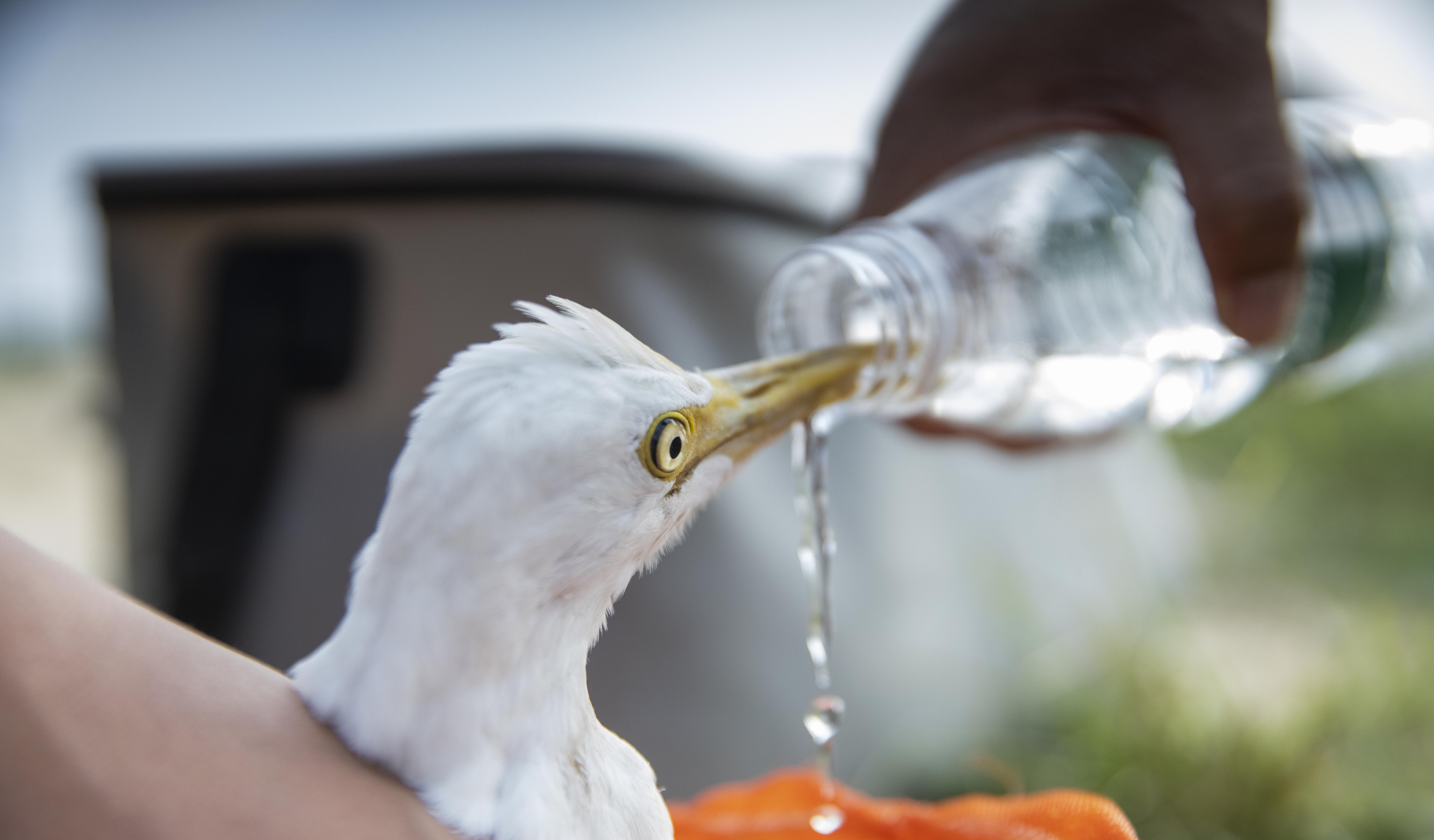 11月7日,志愿者给一只刚被解救下来的池鹭喂水。