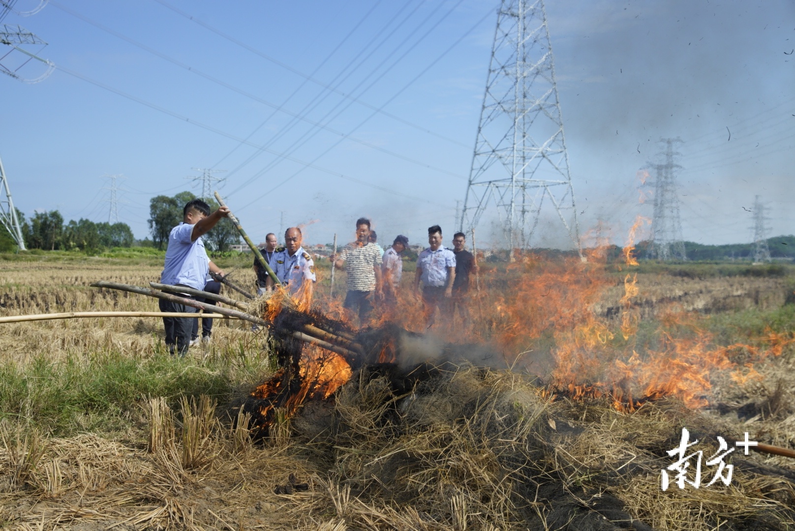 午间,潭西镇查处现场,工作人员将收缴的竹竿和捕鸟网集中烧毁,从源头上除掉田间湿地内的候鸟安全隐患。