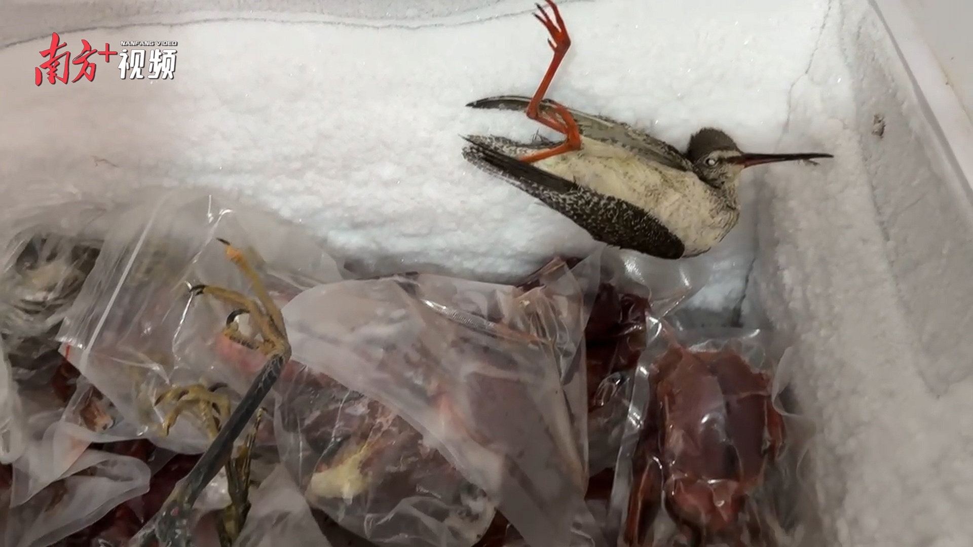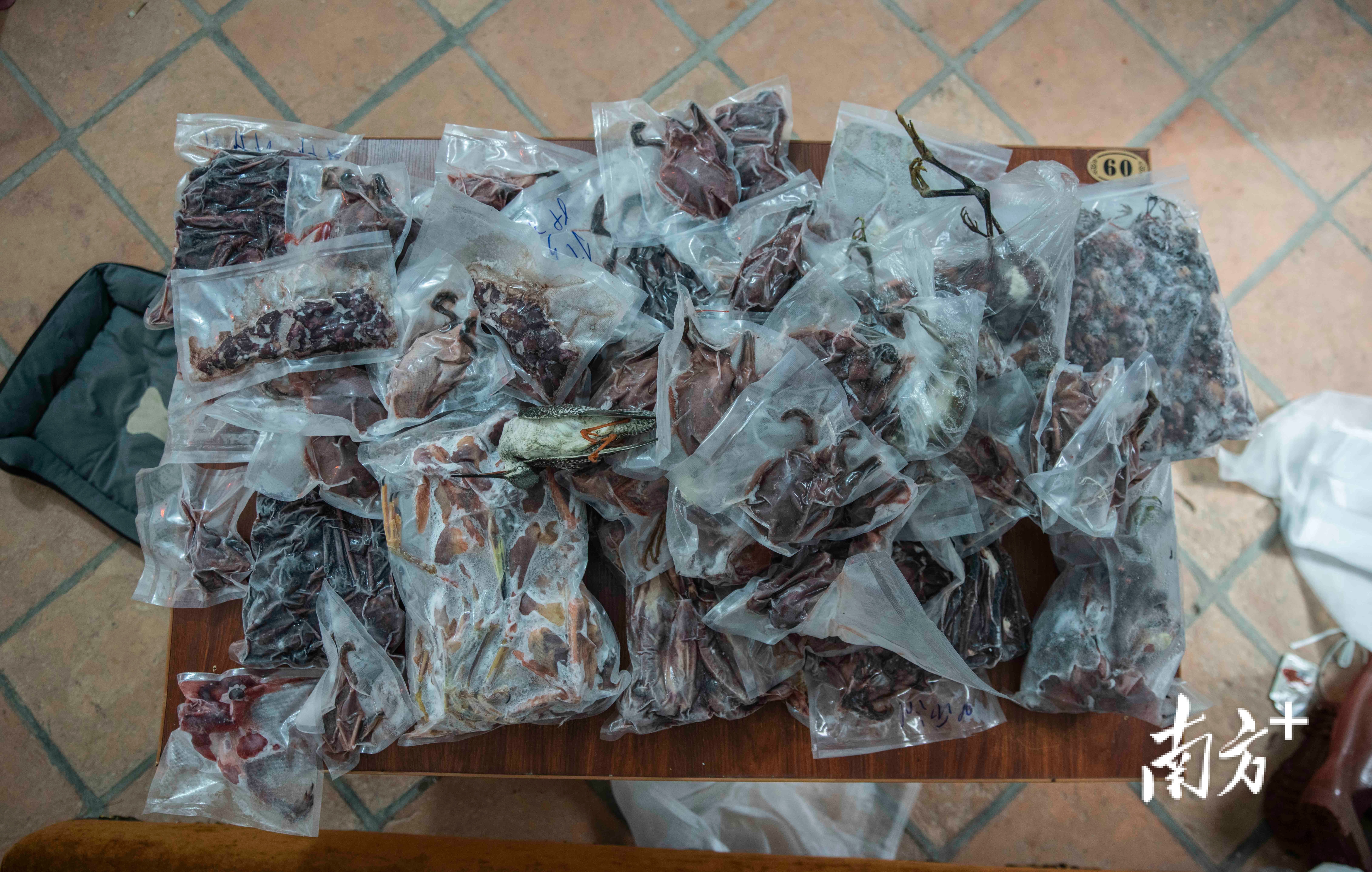 11月13日,汕尾潭西镇,执法人员清点民房中待售的野生鸟类冻品,其数量之大触目惊心。
