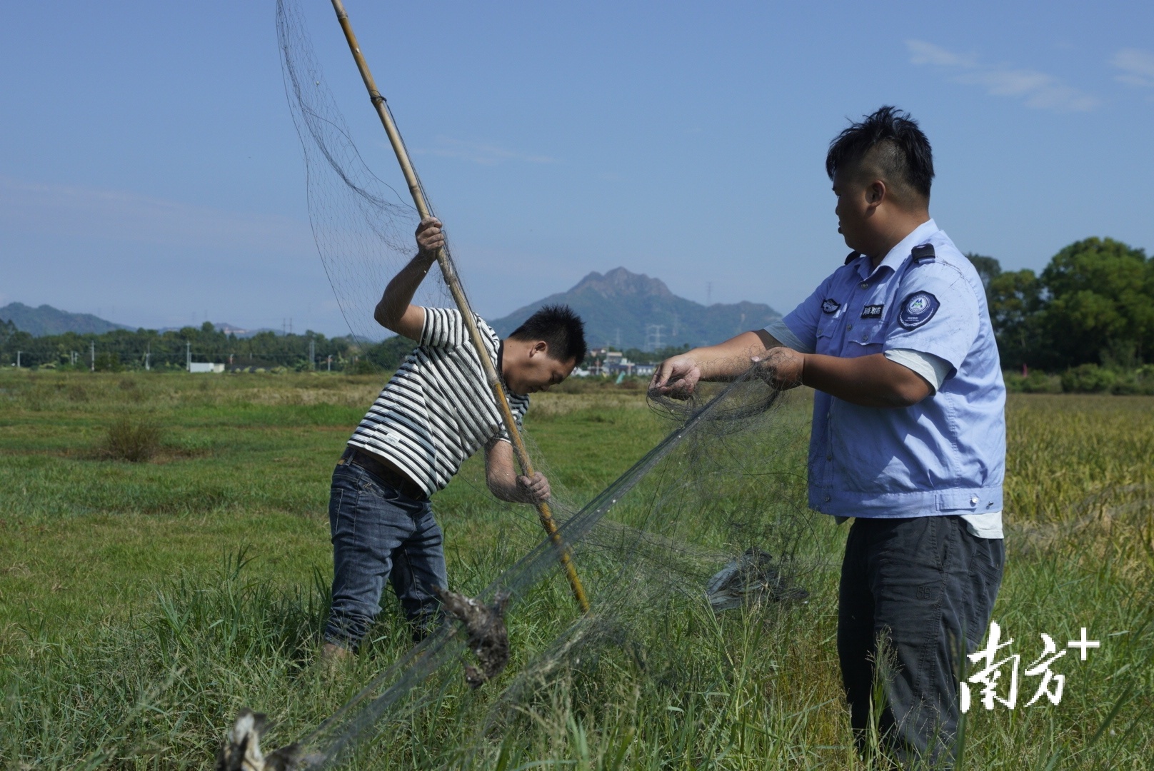 11月13日中午,陆丰市潭西镇的执法人员将发现的鸟网拆除。