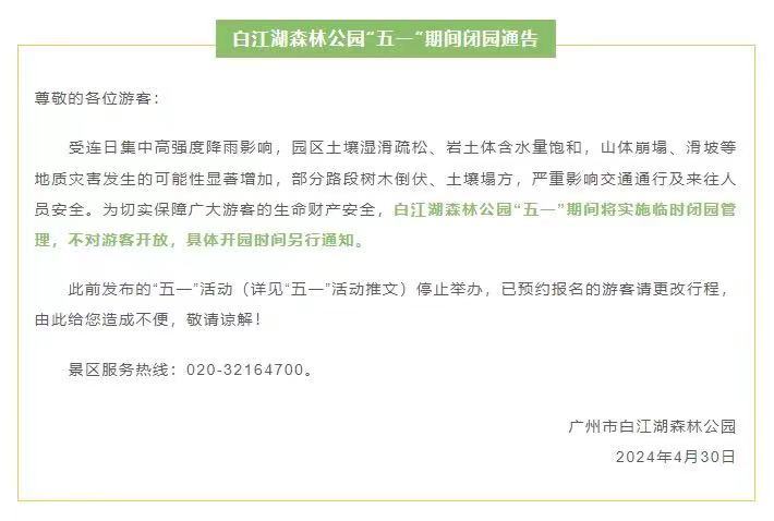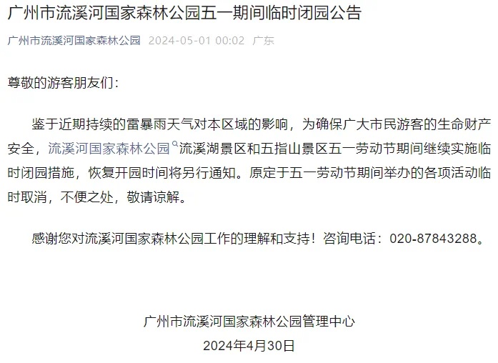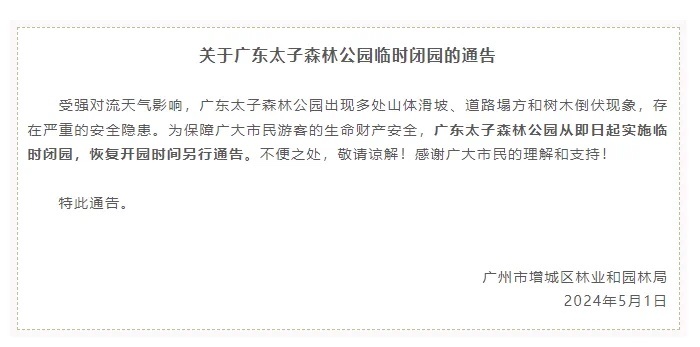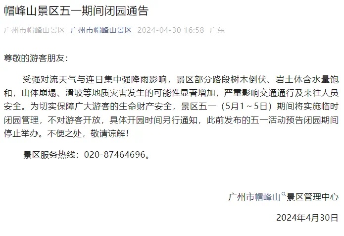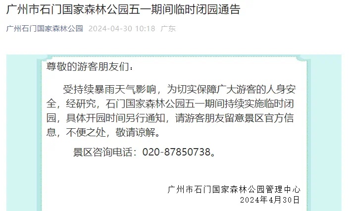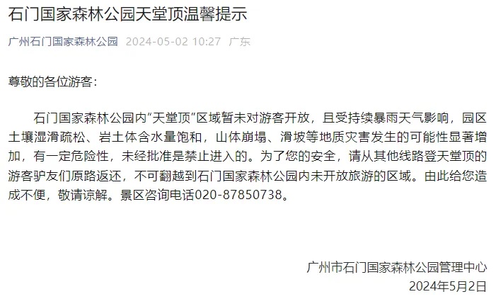 此外,5月2日,广州市石门国家森林公园再次发文提醒,石门国家森林公园内“天堂顶”区域暂未对游客开放,且受持续暴雨天气影响,园区土壤湿滑疏松、岩土体含水量饱和,山体崩塌、滑坡等地质灾害发生的可能性显著增加,有一定危险性,未经批准禁止进入。