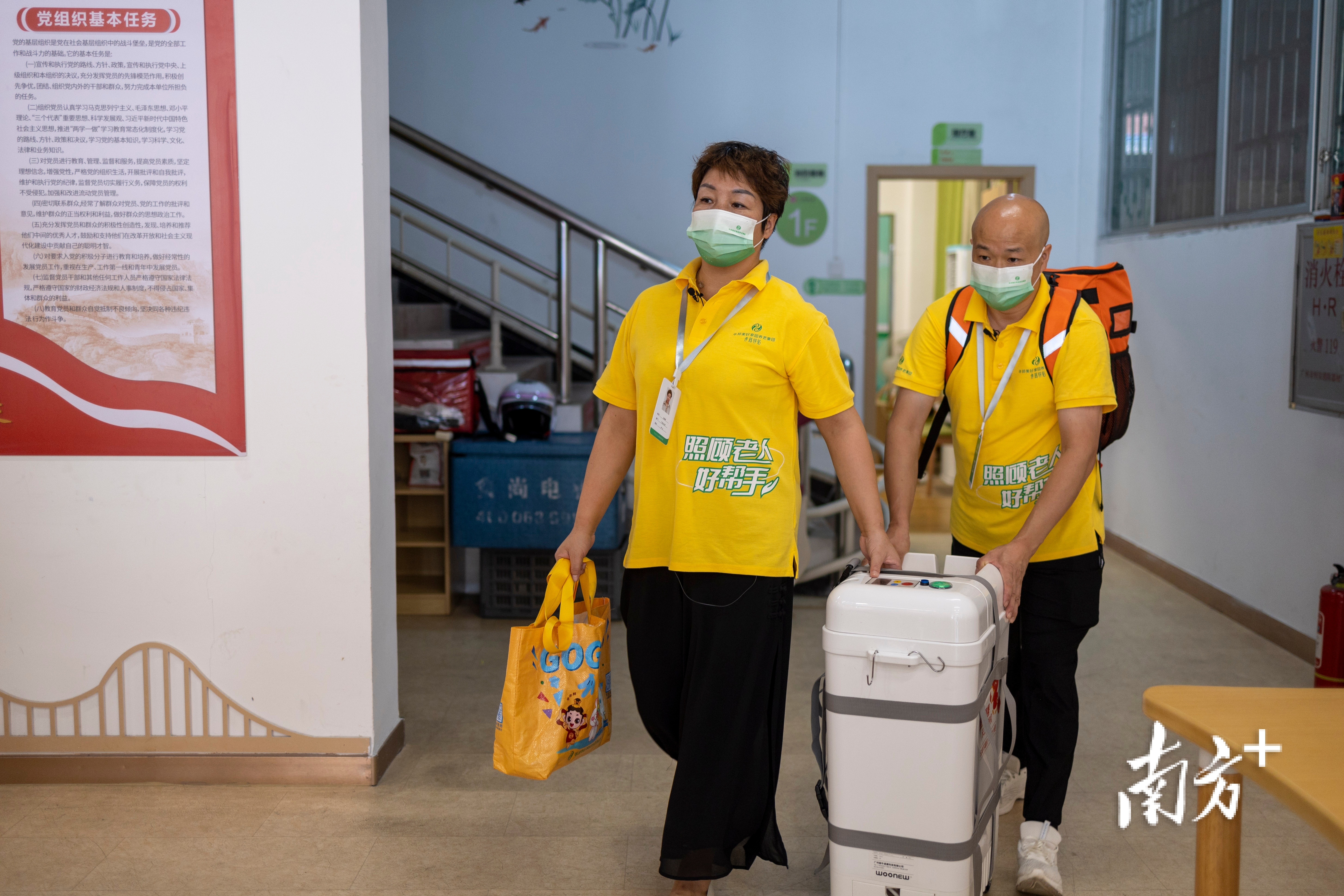 颜东和白凤荣提着移动助浴设施,准备前往服务对象家。
