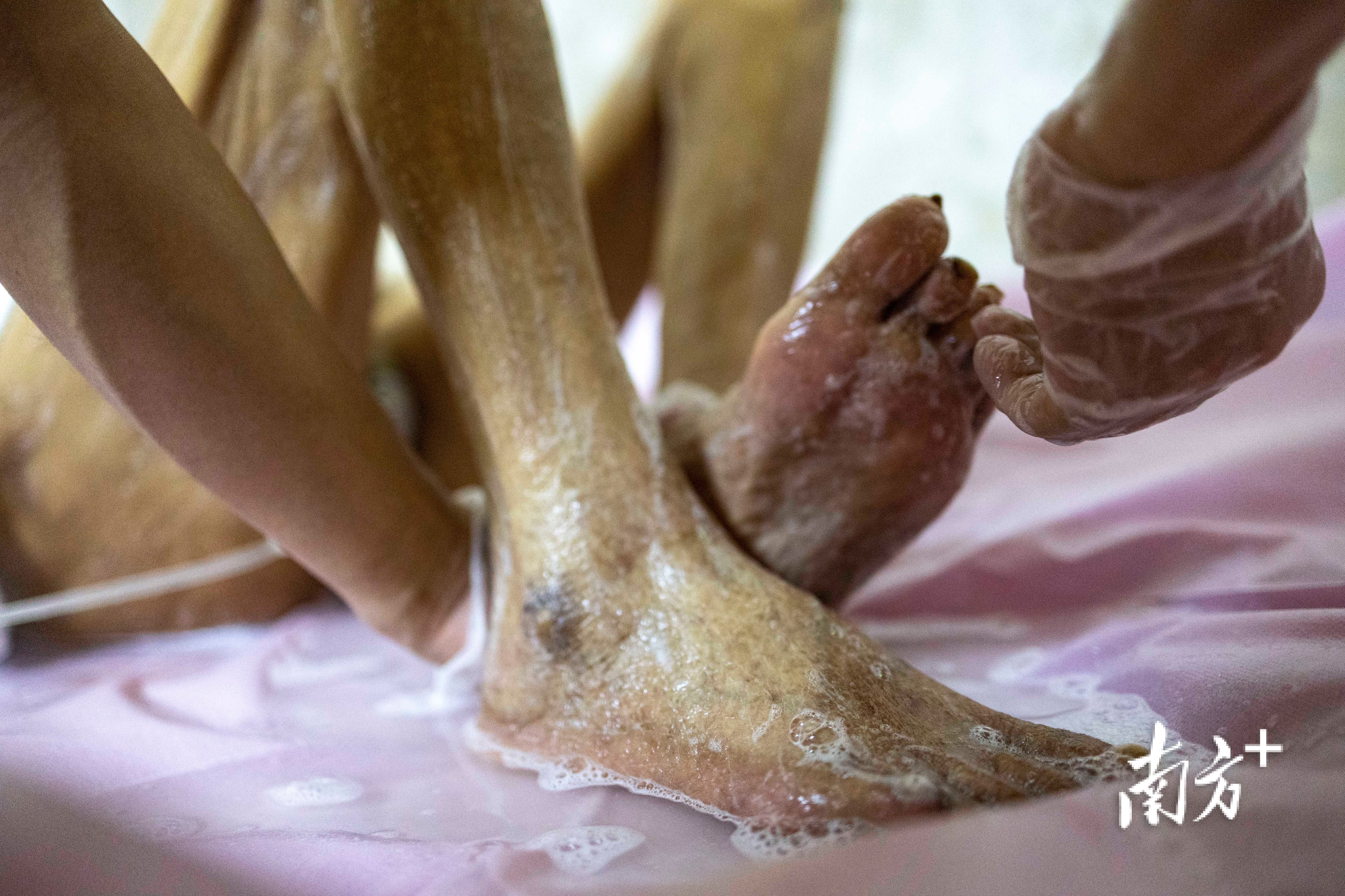 在广州荔湾区芳村逼仄的浴室里,陈奶奶疼得倒吸一口气。她得了甲沟炎的脚肿得老大。洗完澡后,颜东半蹲在地上,拿起指甲剪慢慢帮陈奶奶处理脚趾,看着脚逐渐消肿才安心离开。