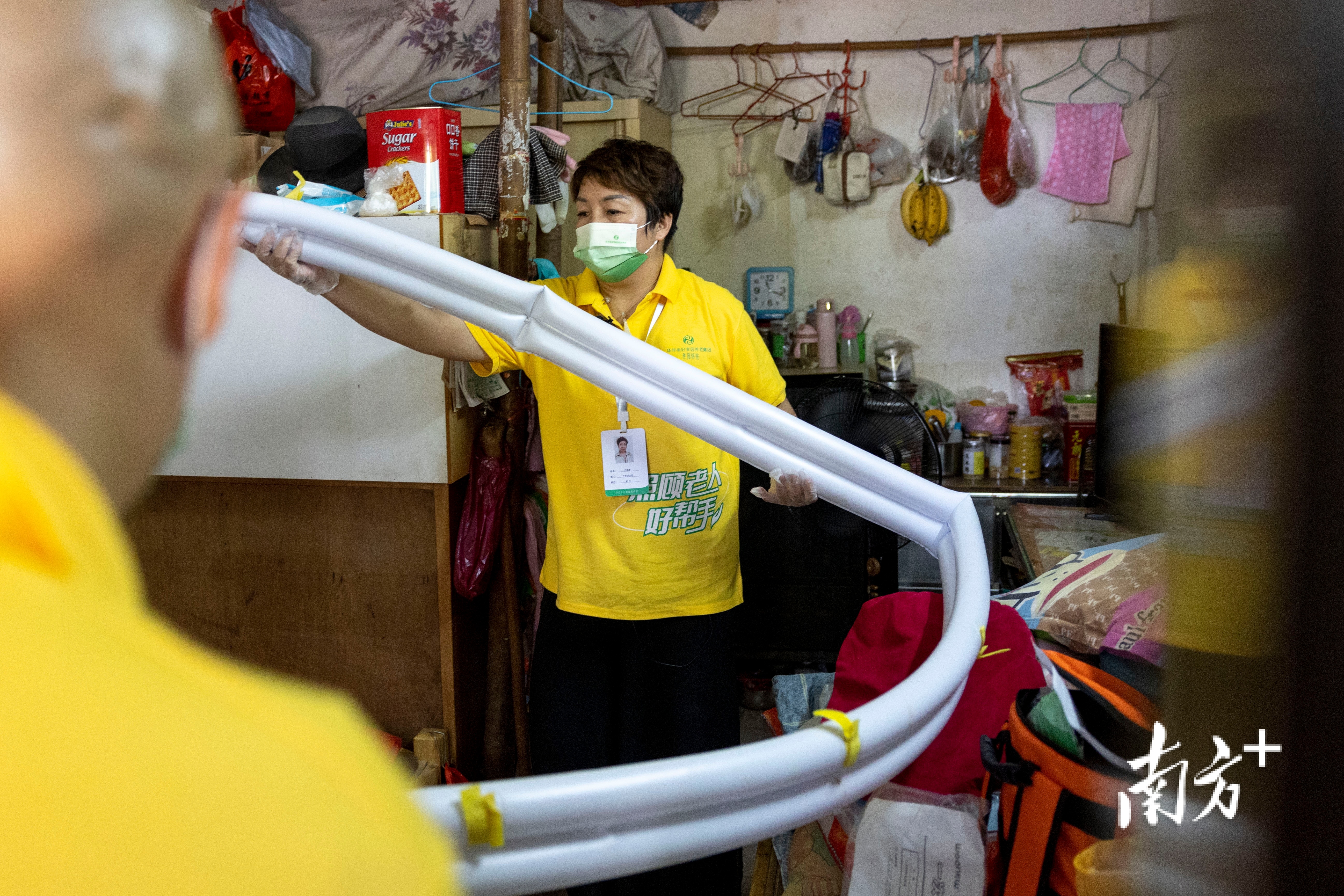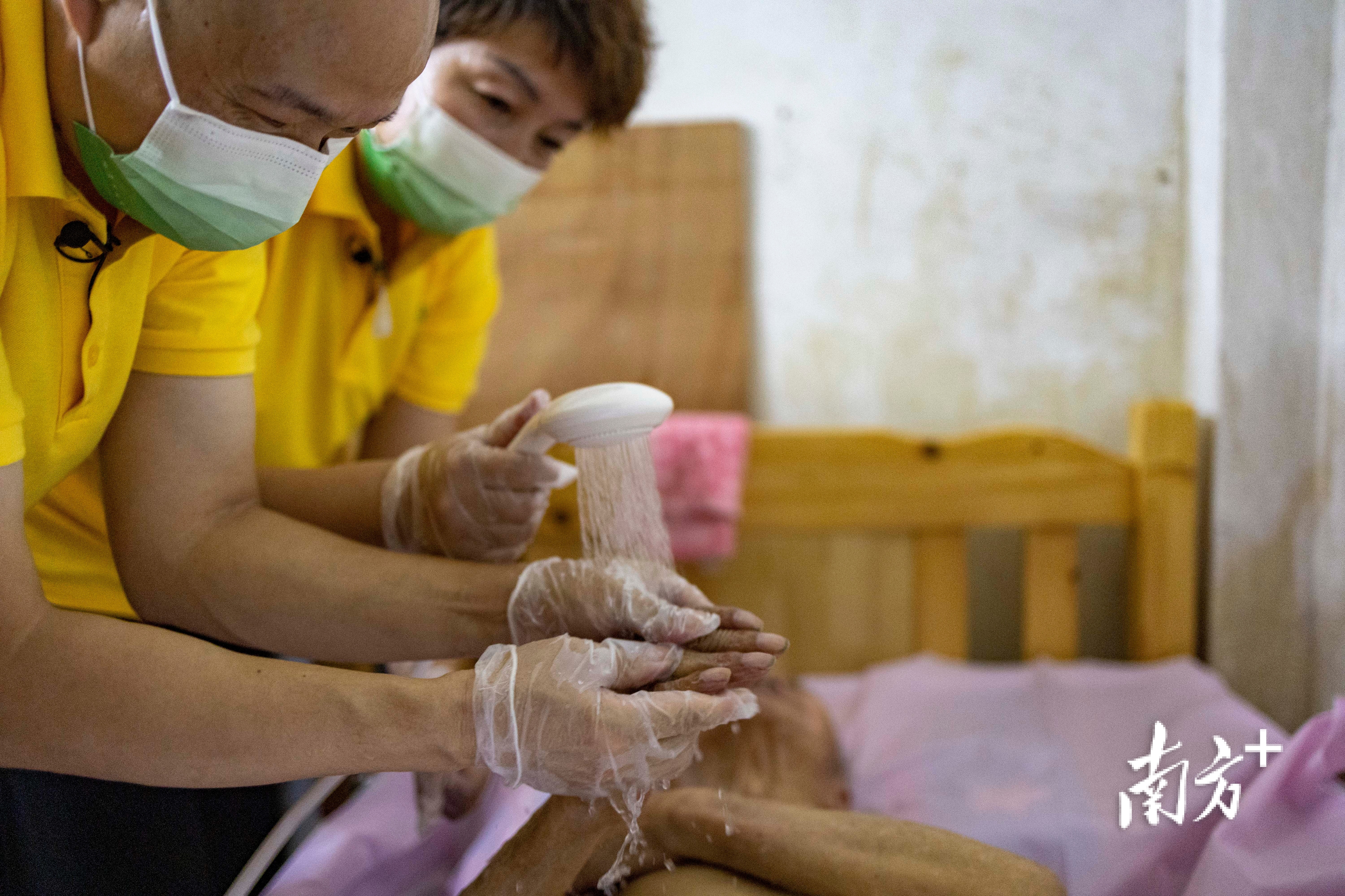 这种心疼让颜东对老人舒坦的笑容渴望更甚。荔湾区一座小平房里,他卖力又温柔地为梁世朱擦拭着身体。梁世朱的妻子从日复一日的照护任务中短暂抽身,张罗着倒水,接待久违的年轻客人,儿子则站在父亲的小床边,时不时地递上洗漱用品。小屋里拥挤又温馨。