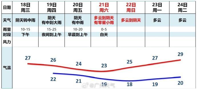 在风雨天气中,广州市区日最高气温将从18日余下时间的27℃下降至21日的23℃,伴随风雨影响减弱,日最高气温将从21日的23℃回升至24日的29℃。但相比日最高气温,日最低气温回升较慢,预计从19日的22℃跌至21日至23日期间的18~19℃。