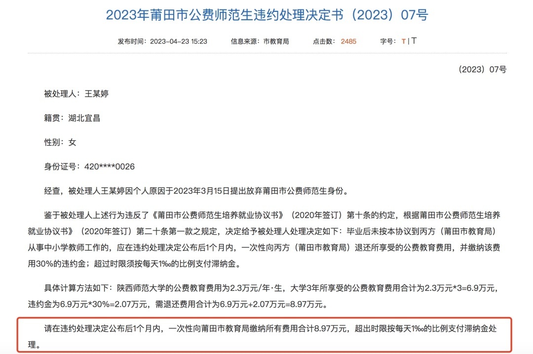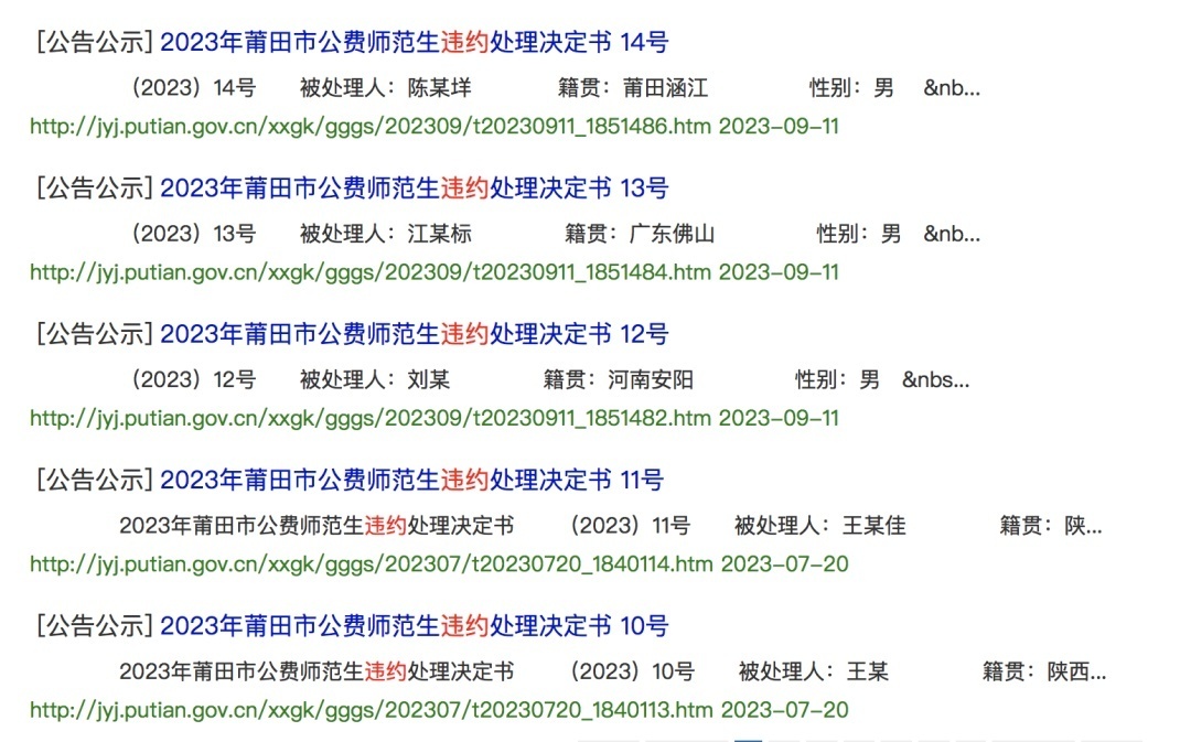 今年以来,福建莆田市教育局曾发布多则公费师范生违约处理决定书。
