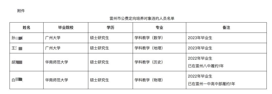 9月27日,广东雷州市教育局发布通报,公布公费定向培养对象违约人员名单。