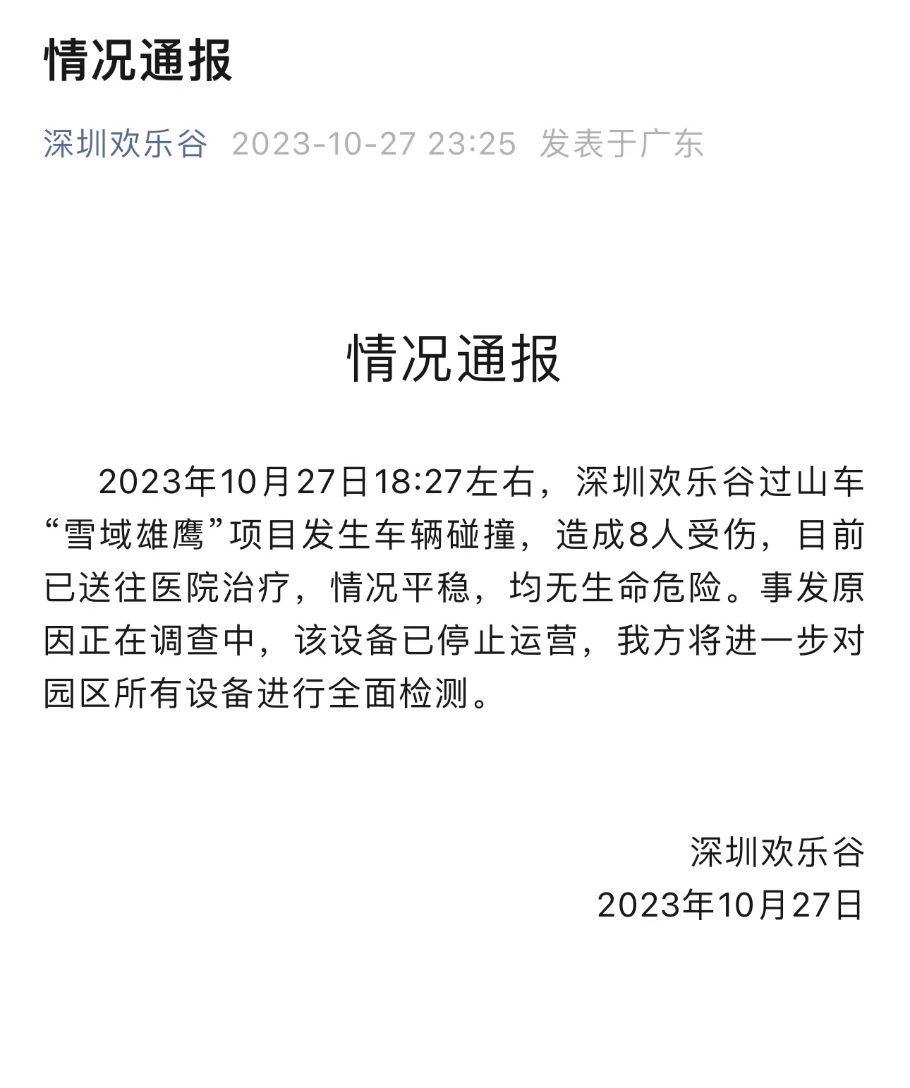 10月27日,深圳欢乐谷发布情况通报。全文如下: