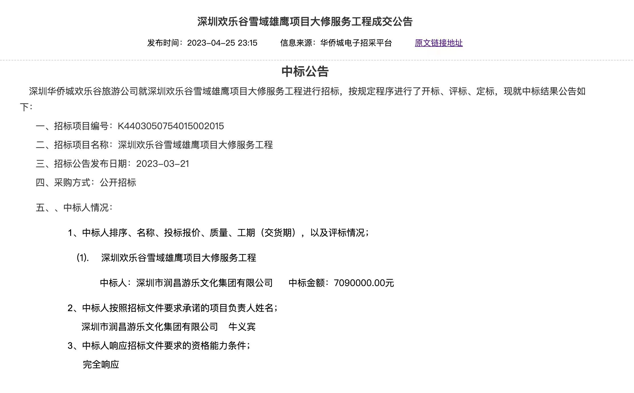 今年4月25日,全国公共资源交易平台公布的一则“深圳欢乐谷雪域雄鹰项目大修服务工程成交公告”显示,3月21日,深圳华侨城欢乐谷旅游公司就深圳欢乐谷“雪域雄鹰项目”大修服务工程发布公告进行招标,深圳市润昌游乐文化集团有限公司以709万中标。