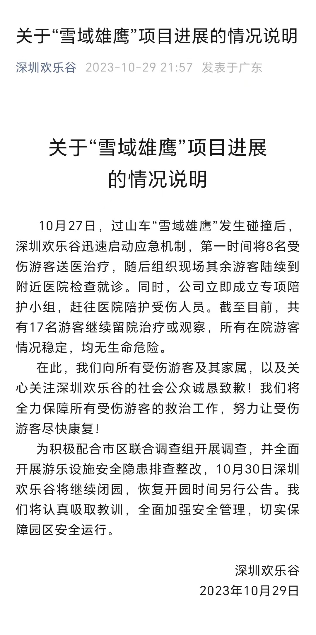 2023年10月27日,深圳欢乐谷过山车“雪域雄鹰”项目发生车辆碰撞。深圳欢乐谷迅速启动应急机制,第一时间将8名受伤游客送医治疗;随后组织现场其余游客陆续到附近医院检查就诊;同时,立即成立专项陪护小组,赶往医院陪护受伤人员。截至目前,共有17名游客继续留院治疗或观察,所有在院游客情况稳定,均无生命危险。
