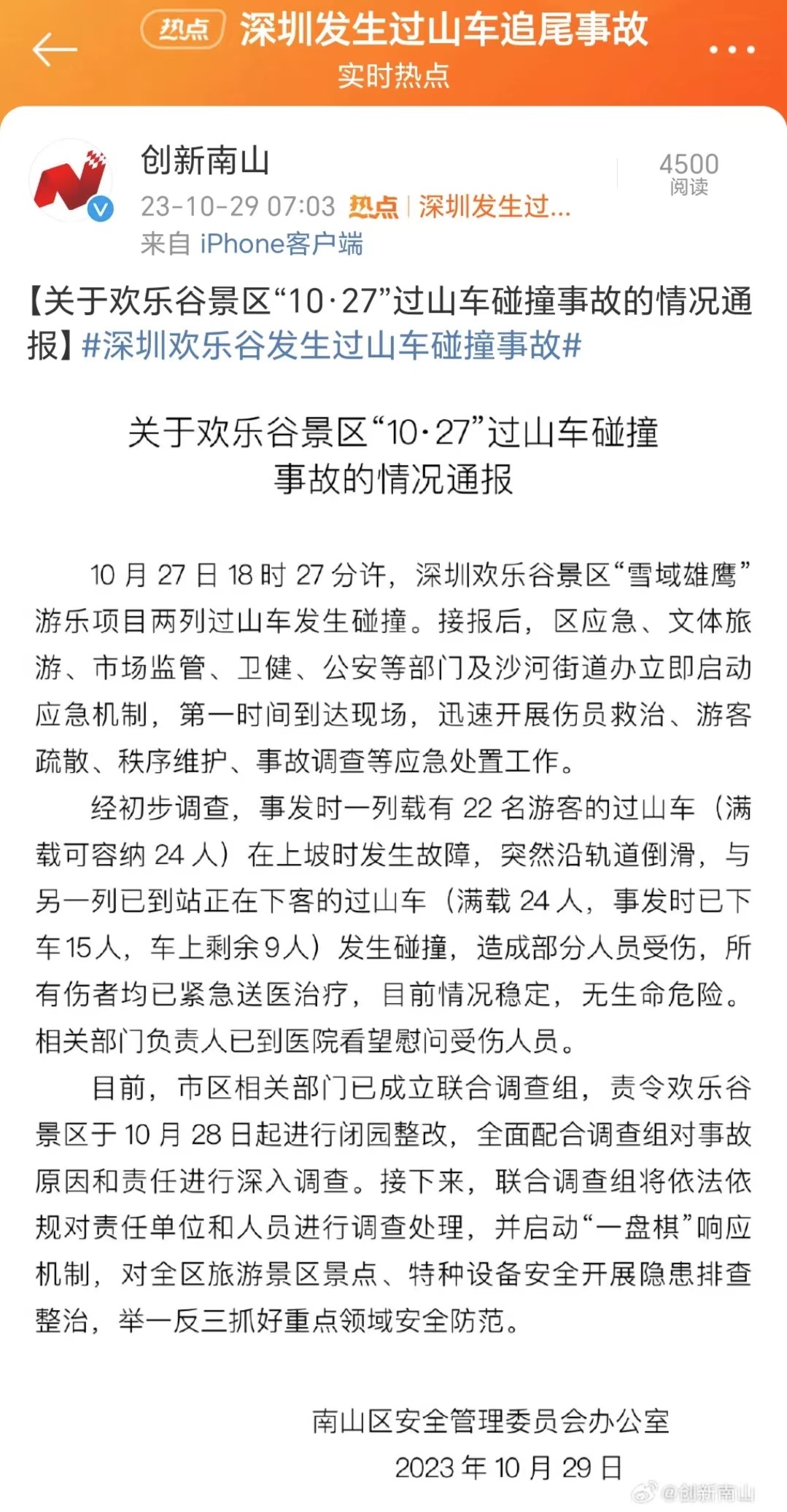 关于欢乐谷景区“10.27”过山车碰撞事故的情况通报