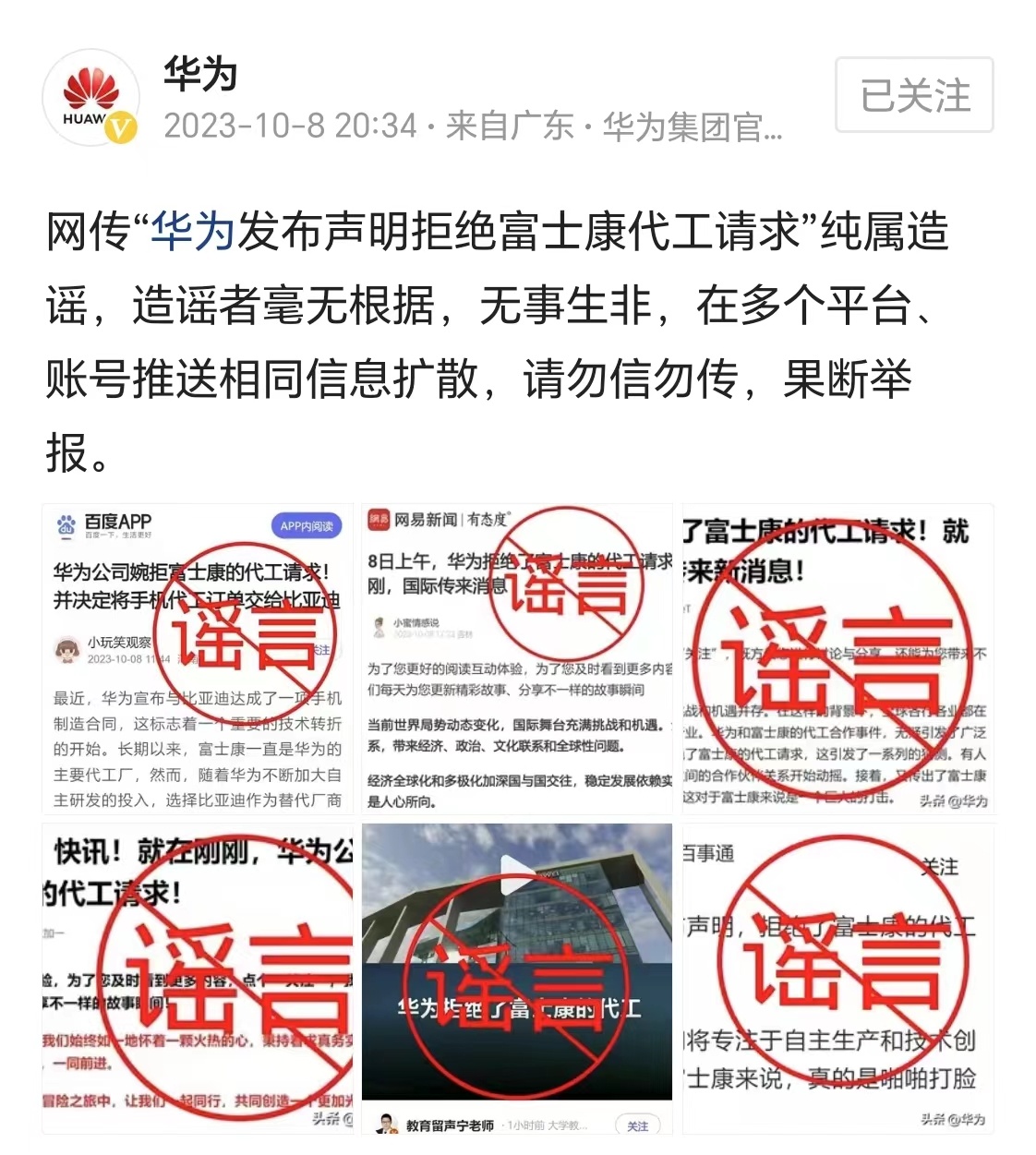 10月8日晚,华为集团官方社交账号发布声明称,网传“华为发布声明拒绝富士康代工请求”纯属造谣,造谣者毫无根据,无事生非,在多个平台、账号推送相同信息扩散,请勿信勿传,果断举报。