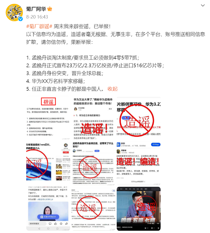 8月20日16时许,华为官方微博“菊厂阿华”在周末辟谣,称孟晚舟谈淘汰制度/要求员工必须做到4零5带7抓、孟晚舟正式宣布23万亿/2.3万亿投资/停止进口516亿芯片等、孟晚舟晋升全球总裁、华为XX万名科学家移籍等均为造谣,造谣者毫无根据、无事生非,在多个平台、账号推送相同信息扩散,请勿信勿传,果断举报。
