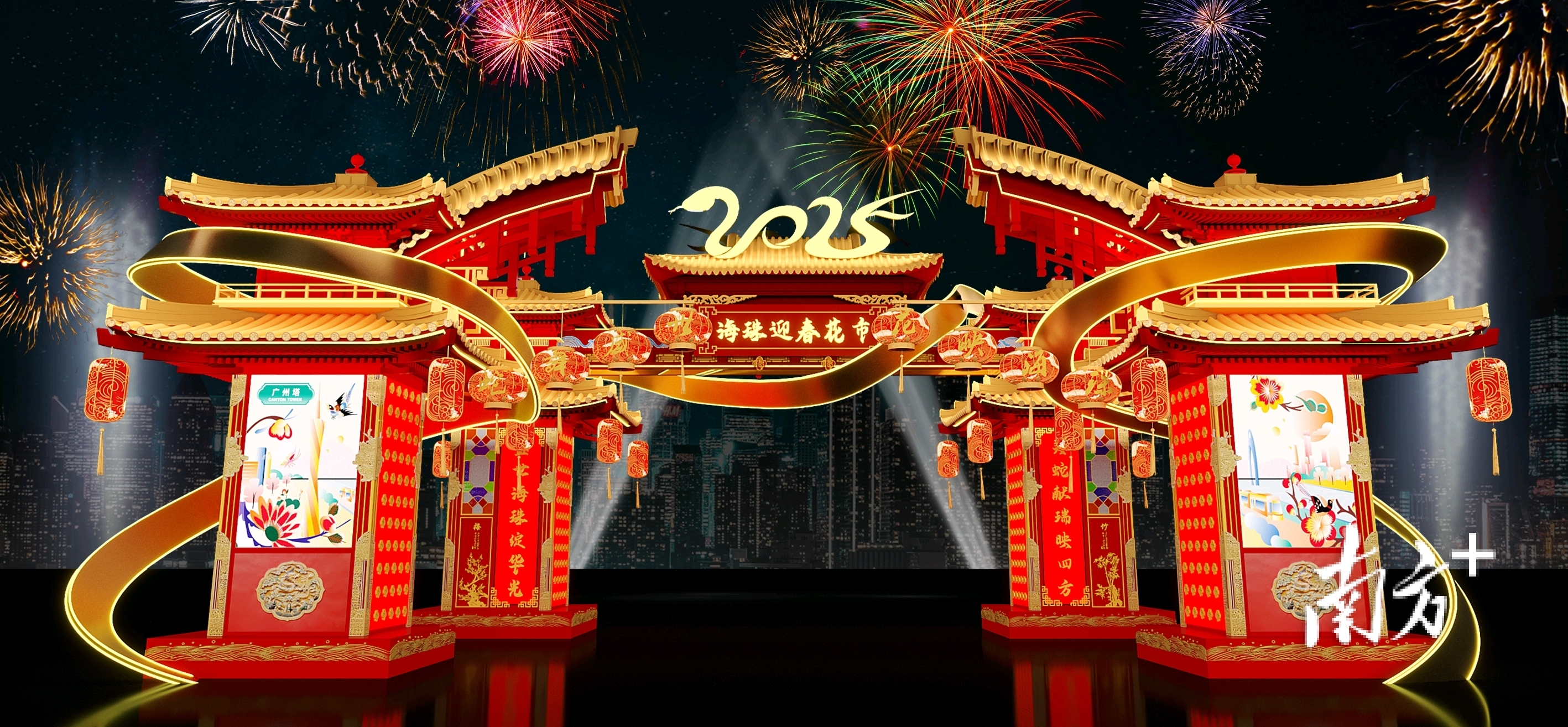 2025年海珠花市牌楼以“海港古韵,灵蛇献瑞”为灵感,保留传统建筑韵味的同时融入现代设计元素,参照传统古建大宅的空间布局以及港口吊机和航标塔的形象,体现海珠区作为海上丝绸之路重要港口的历史地位。融入海珠“六大名片”和“梅兰竹菊”手绘图以及蛇年吉祥元素,传达“千年花洲,欣欣海珠”新年新气象的美好愿景。