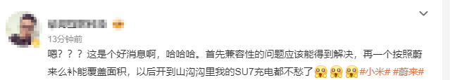 小米汽车连续发文称:“小米汽车携手蔚来,正式开始充电补能网络合作。14000+蔚来充电桩入驻小米充电地图,支持在充电地图中实时查看蔚来充电场站的动态数据,同时支持小米汽车APP扫码充电。为用户提供更高效,更便捷的充电补能服务!”