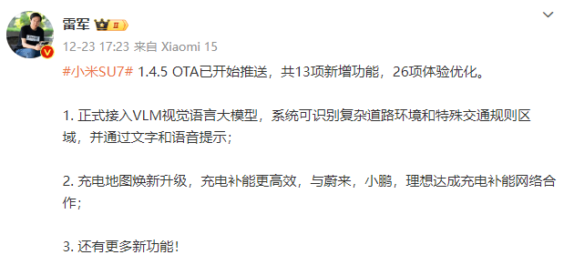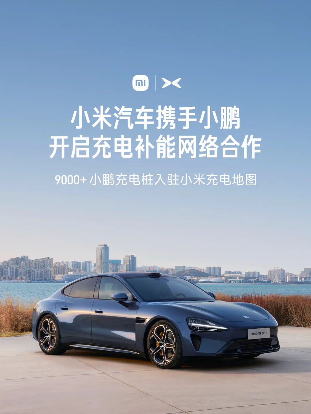 “小米汽车携手小鹏汽车,正式开始充电补能网络合作。9000+小鹏充电桩入驻小米充电地图,支持在充电地图中实时查看小鹏充电场站的动态数据,同时支持小米汽车APP扫码充电与即插即充服务,充电补能更高效!”