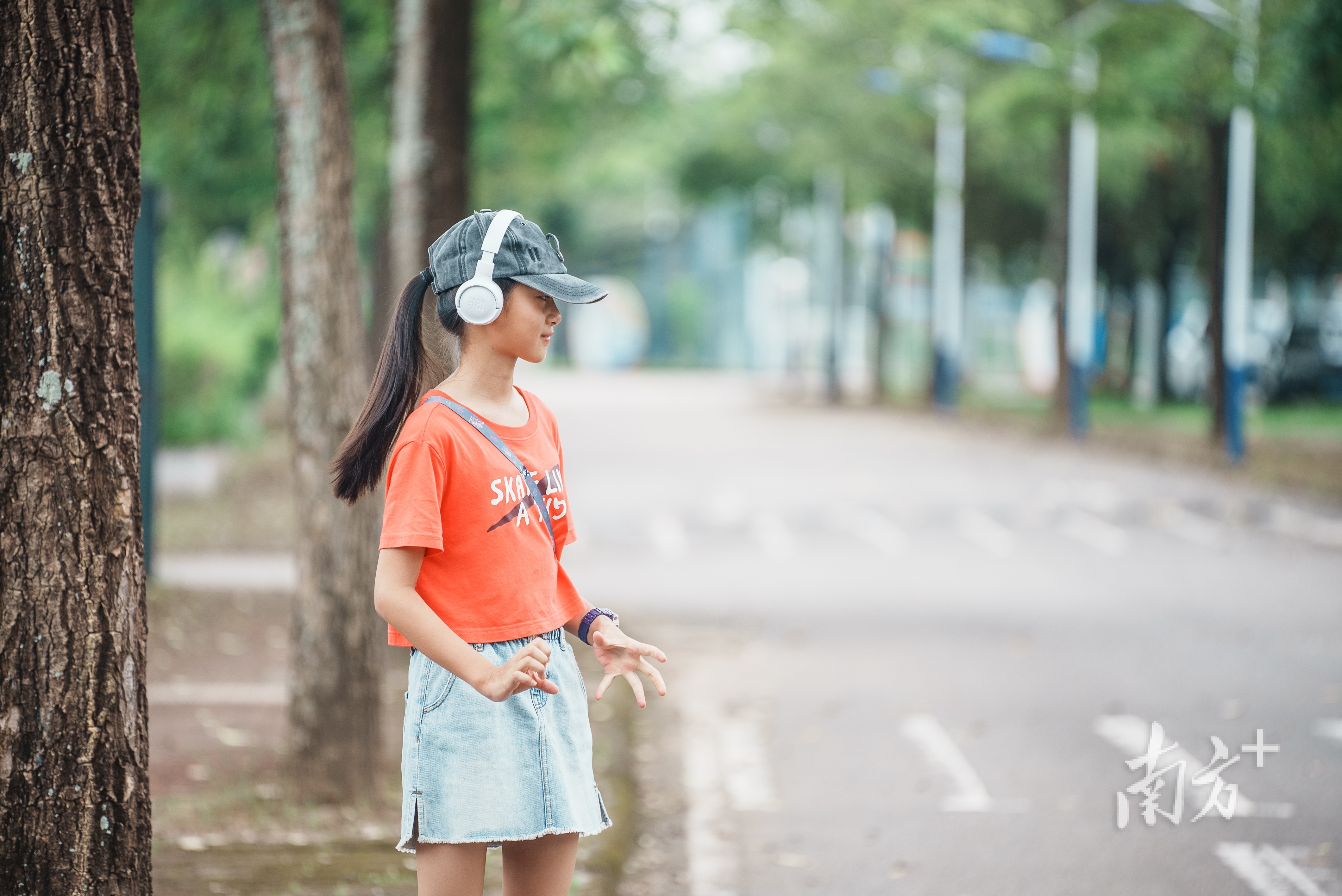 几天前,记者在惠州体育运动学校滑板场见到了郑好好,她身穿橘红色T恤、牛仔裙,头顶猫咪造型的棒球帽,白色耳机随意挂在脖上,张口声音很脆,一点也不怯场,有种出奇的松弛感,完美符合网友对她“小孩姐”的称呼。
