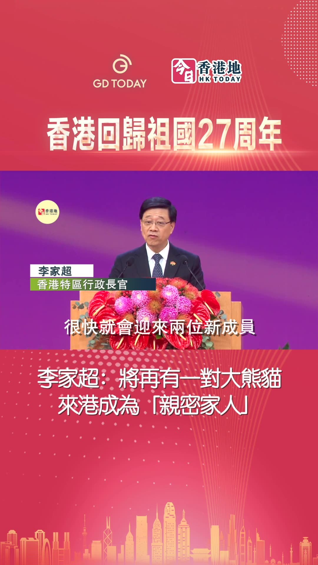7月1日上午,香港特区政府分别在金紫荆广场和会展中心举行升旗仪式和酒会,庆祝香港回归祖国27周年。香港特区行政长官李家超在酒会上宣布,中央政府同意再次送赠一对大熊猫予香港特区。特区政府感谢中央政府,并已展开准备工作,迎接大熊猫来港。