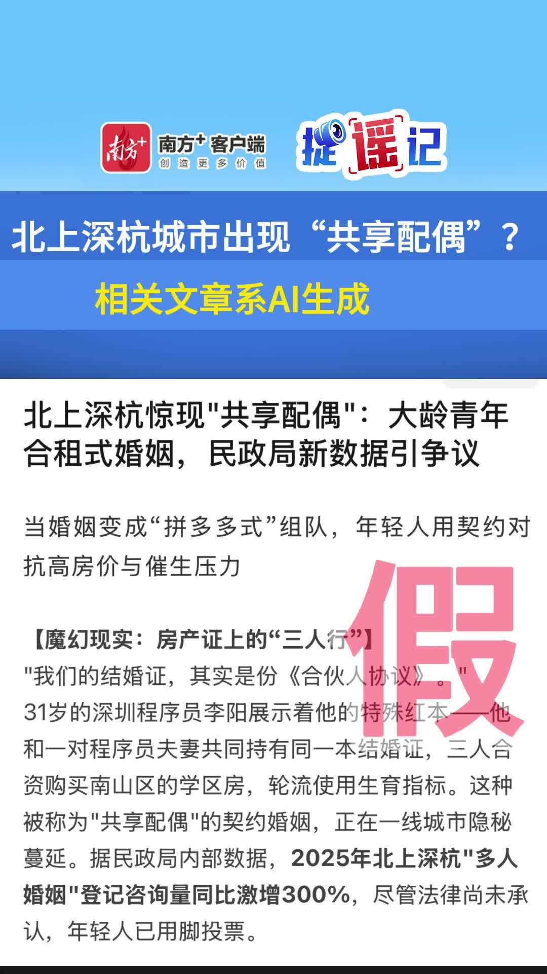 日前,有自媒体文章称,“北上深杭出现‘共享配偶’”,深圳有三人共持同一本结婚证的例子。南方+记者联系到文章发布者,其称,文章由DeepSeek生成,自己不清楚内文案例的真实性,文章已被举报删除。