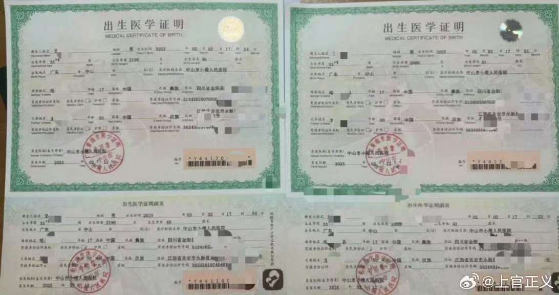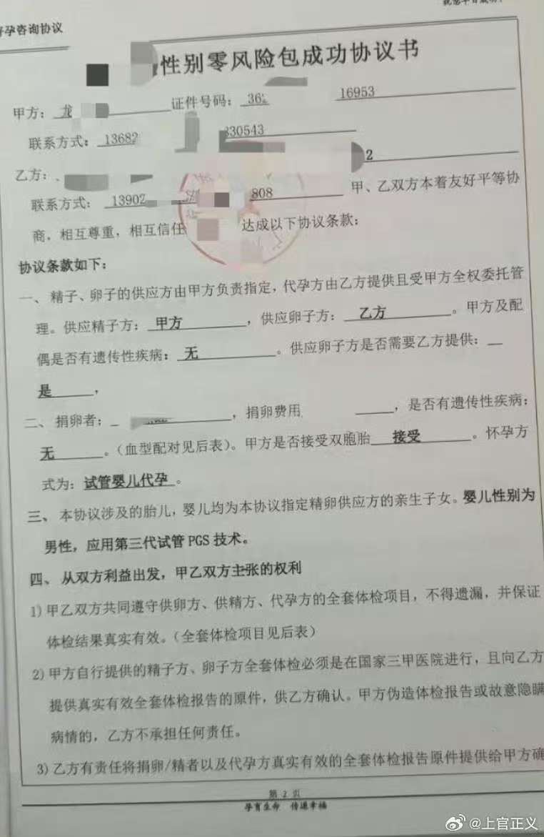 据上官正义透露,他从广州市一代孕机构了解到,2007年5月出生的17岁女孩,为一名50岁的江西永新男子代孕,今年2月2日在中山市小榄镇产下双胞胎。也就是说,这名女孩在植入胚胎时也仅16岁。该代孕机构对外宣传公司为广州爱婴宝医疗咨询服务有限公司,但与客户签订合同的公司为广州君兰医疗设备有限公司。代孕机构提供的出生证明显示,新生儿信息为:龙某生,男,2025年2月2日17:55分在中山市小榄镇人民医院出生,出生证明签发时间为2025年2月12日;母亲信息为:哈某,年龄17岁,四川省金阳县人,出生日期为2007年05月;父亲为:龙某,年龄50岁,江西省永新县人,出生日期为1974年4月。该公司业务员还表示,代孕价格根据学历定。合同显示,龙某某与广州君兰医疗设备有限公司签订供卵、代孕协议,代孕总价格为73万元。上官正义还提供了出生证、代孕协议等相关图片。