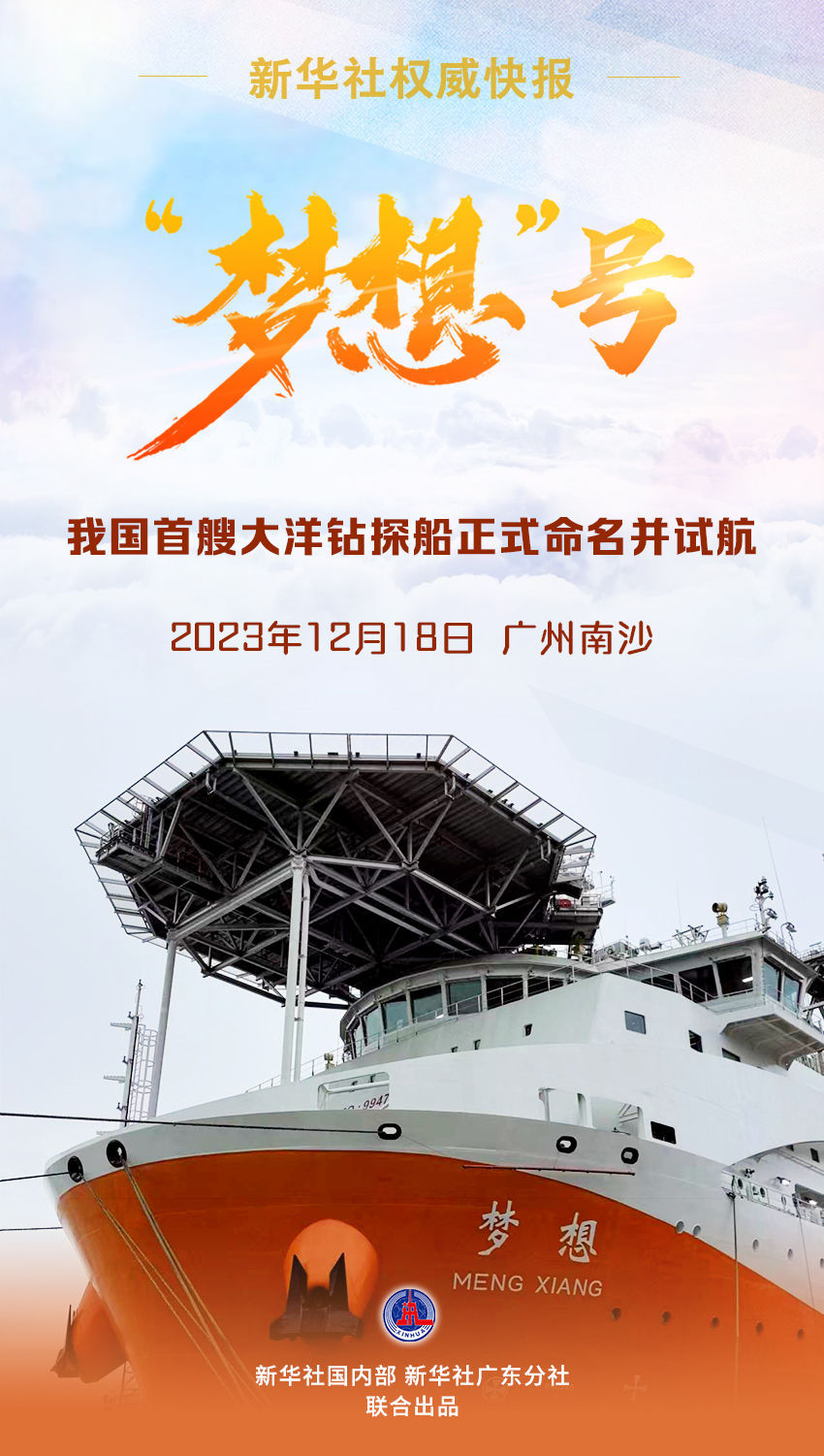 12月18日,我国自主设计建造的首艘大洋钻探船正式命名为“梦想”号,并在广州南沙首次试航。