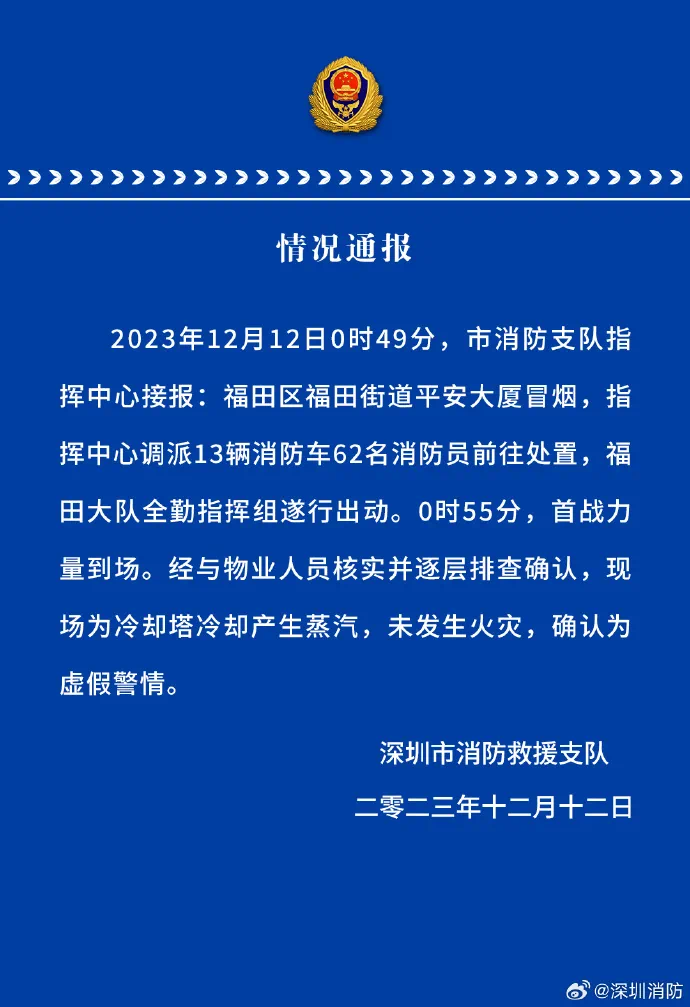 12月12日0时49分,市消防支队指挥中心接报:福田区福田街道平安大厦冒烟,指挥中心调派13辆消防车62名消防员前往处置,福田大队全勤指挥组遂行出动。0时55分,首战力量到场。经与物业人员核实并逐层排查确认,现场为冷却塔冷却产生蒸汽,未发生火灾,确认为虚假警情。