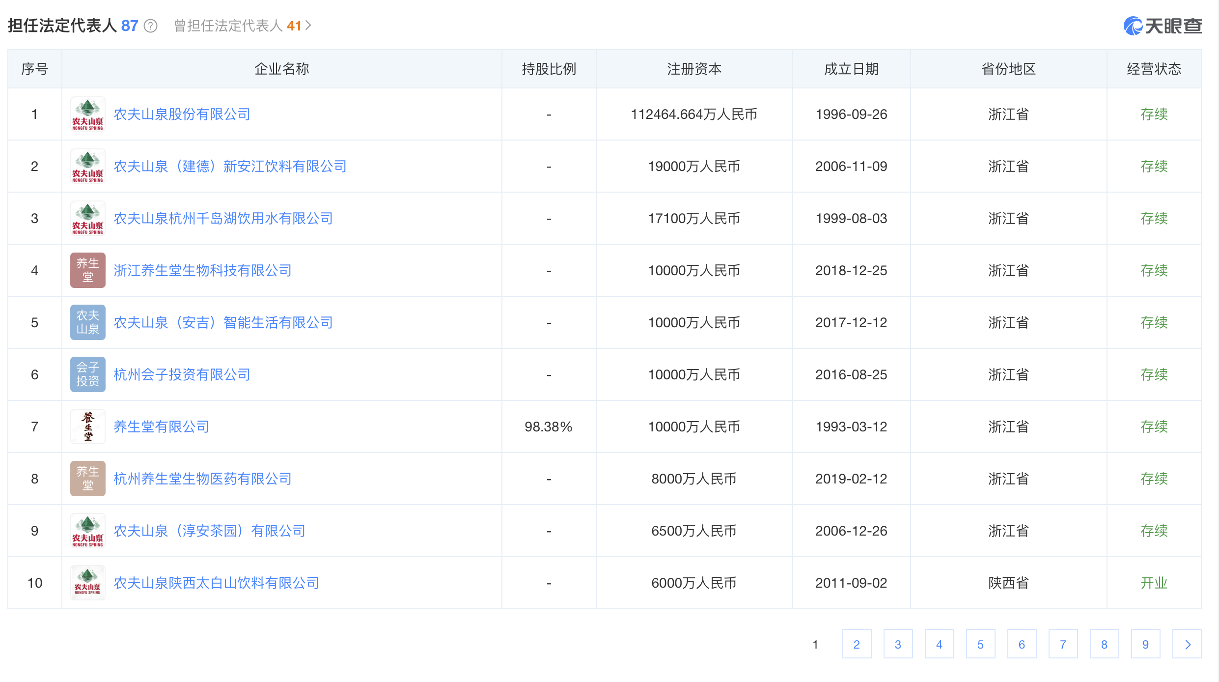 根据天眼查APP,饶明红目前担任包括农夫山泉抚松长白山天然矿泉水有限公司、农夫山泉浙江千岛湖有限公司等24家公司法定代表人。钟睒睒目前担任包括农夫山泉股份有限公司在内的87家公司法定代表人。