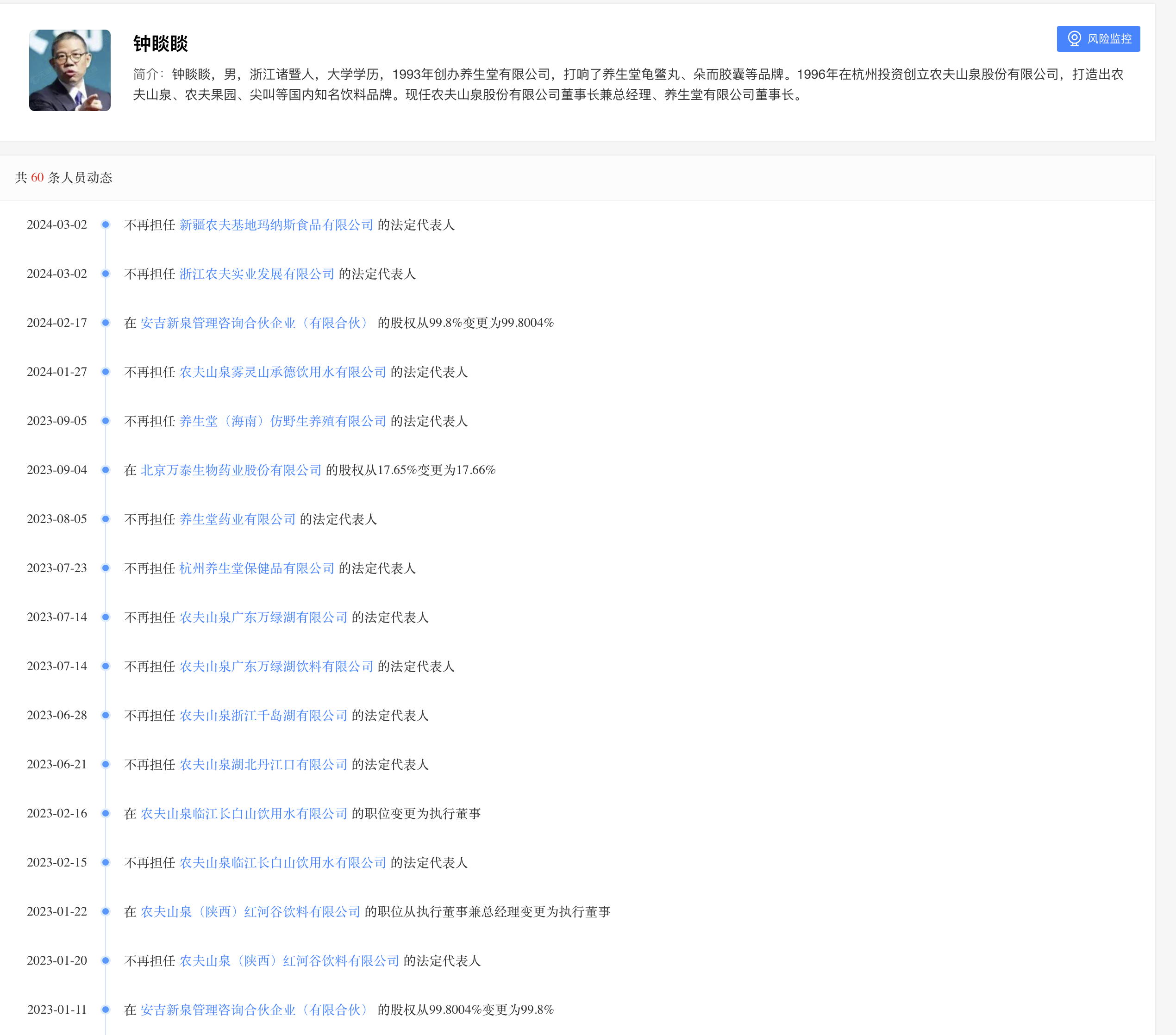 天眼查显示,2023年以来,钟睒睒已经卸任12家农夫山泉旗下公司的法定代表人职务。