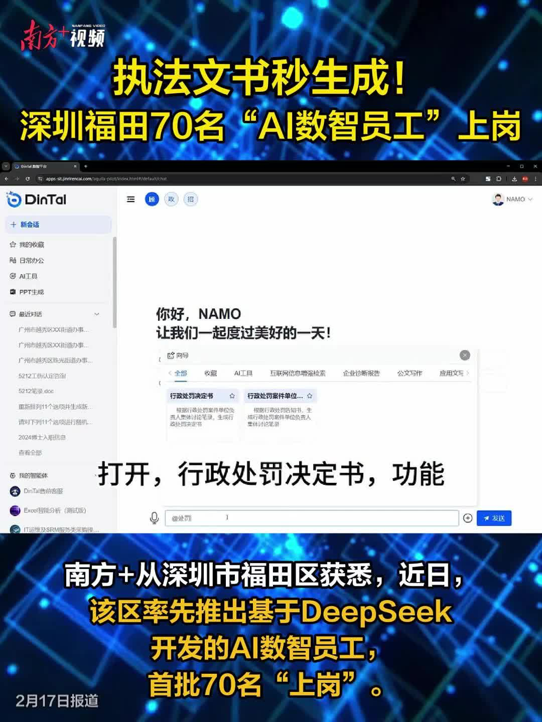 南方+从深圳市福田区获悉,近日,该区率先推出基于DeepSeek开发的AI数智员工,首批70名“上岗”。