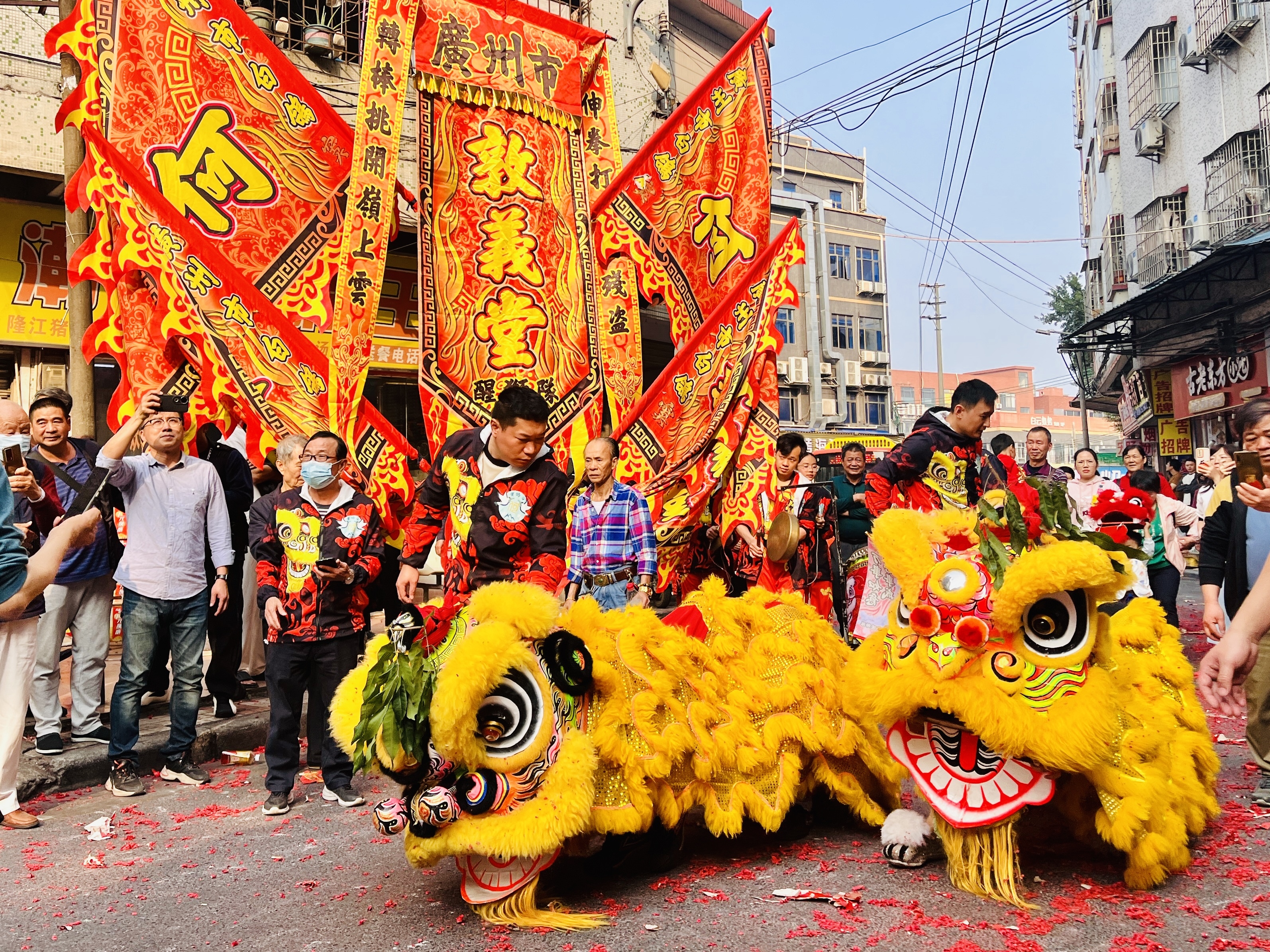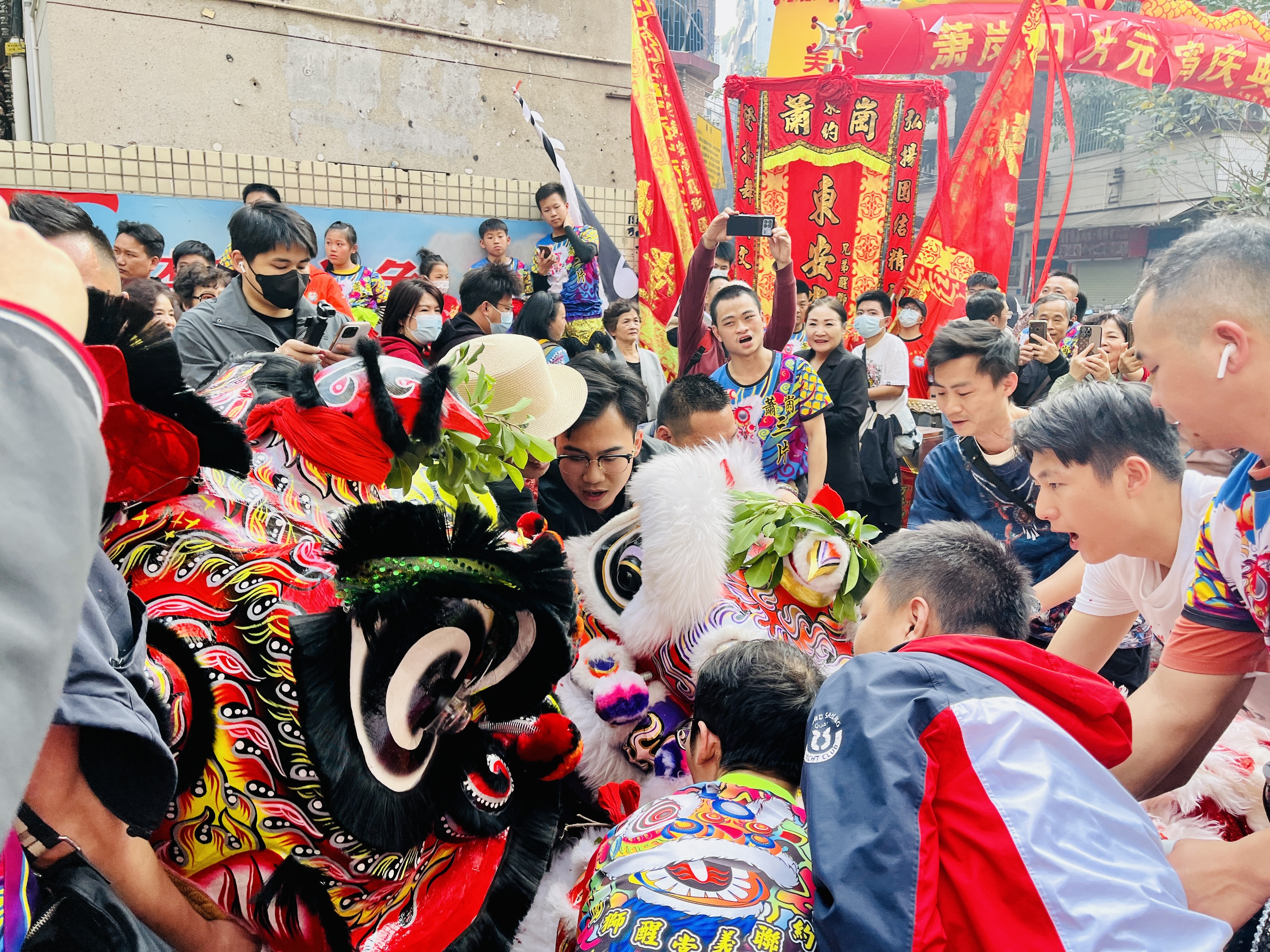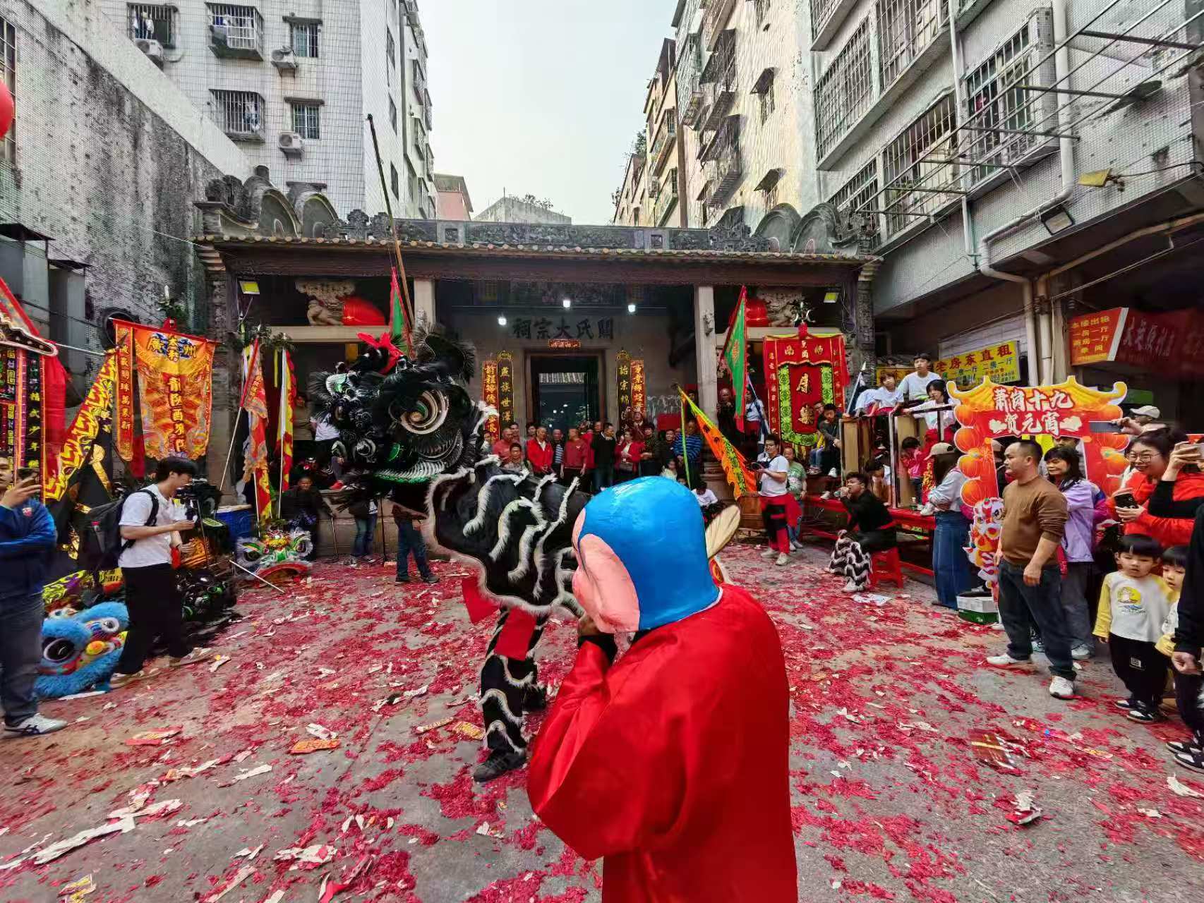 上午萧岗村东安堂、翕志堂堂等6个片的狮队先后绕村巡游,到村内村委大院、得朋书院、祠堂采青,大街小巷里人头涌动,沿途不断有村民群众加入接“福气”,争相抚摸狮头,讨个好意头,醒狮时而扑闪着眼睛,时而俏皮跳跃,与沿途村民互动。
