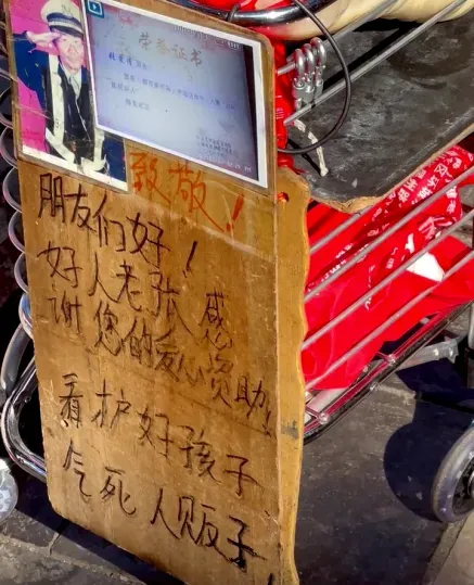 推车上那块“看护好孩子,气死人贩子”的牌子,是他出行的标配。
