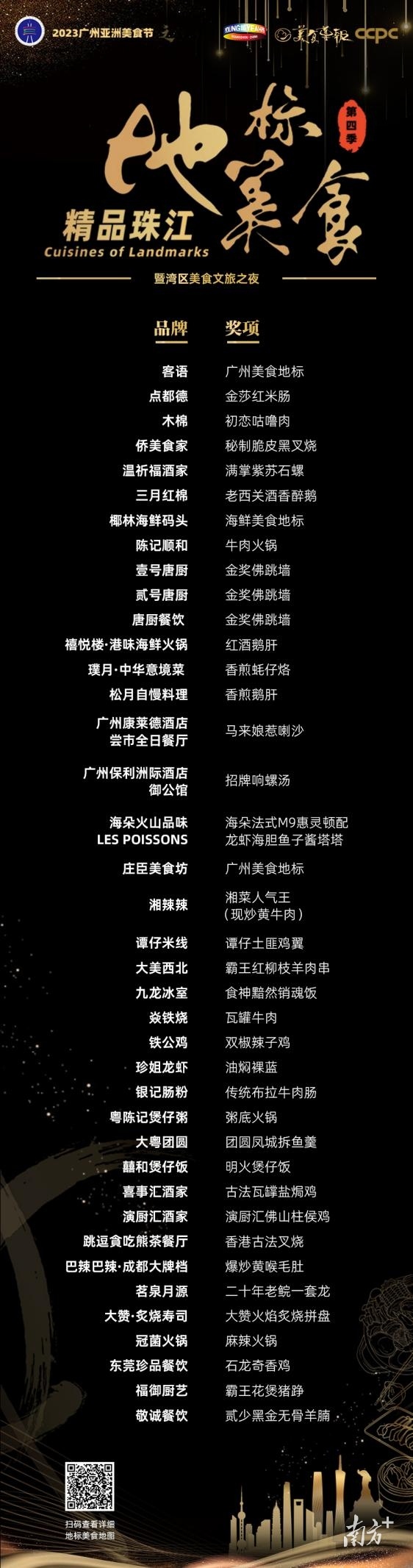 经过专业评审团的精心遴选,30余家餐饮品牌入选了2023“精品珠江·地标美食”,名单如下(排名不分先后):