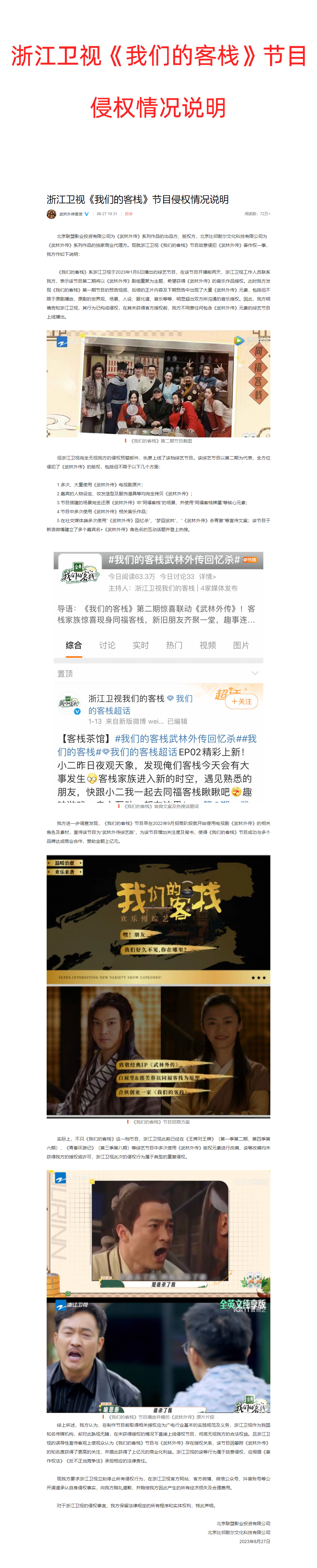 27日,@武林外传官微 发布浙江卫视《我们的客栈》侵权情况说明。说明中称《我们的客栈》在开播前两天才联系版权方,希望获得音乐授权,版权方拒绝后,“浙江卫视完全无视我方的侵权预警邮件,执意上线了该档综艺节目。”同时,官微提出浙江卫视在多个综艺节目中多次在未获得授权或许可下使用《武林外传》版权元素进行改编,“属于典型的重复侵权”。