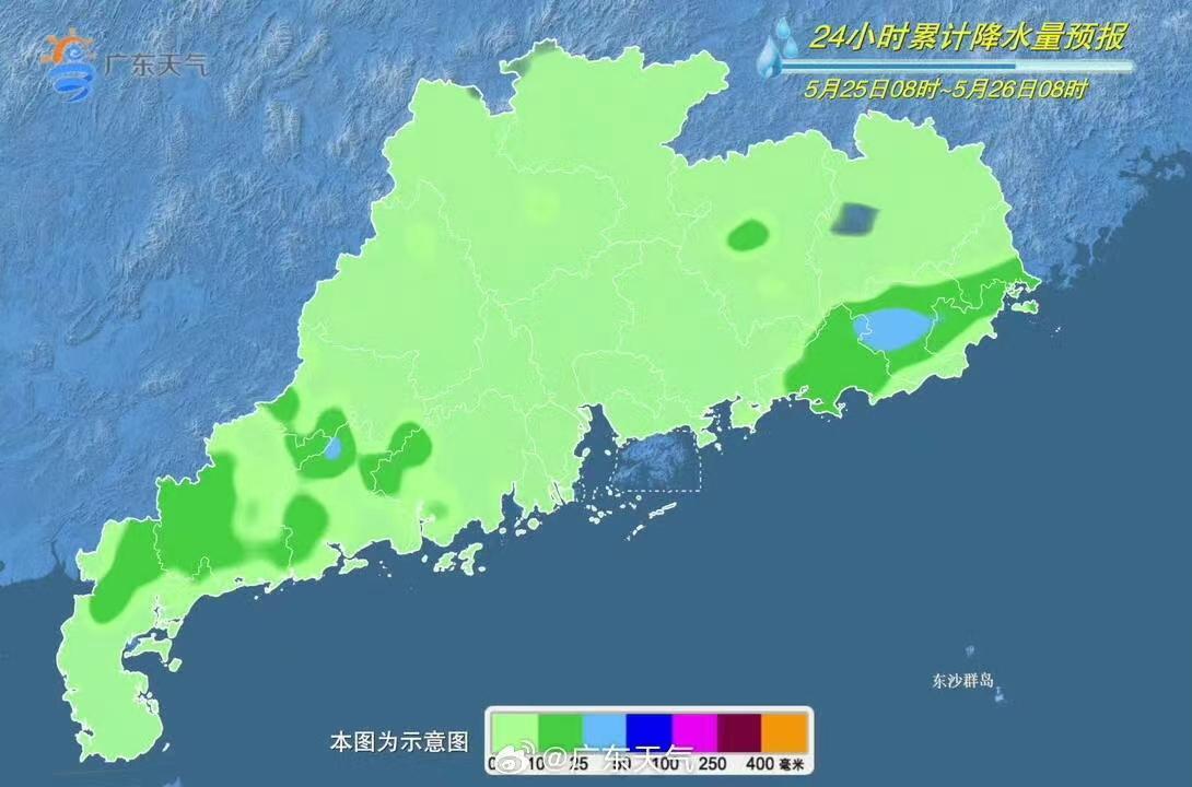 5月25日8时至26日8时广东累计降水量预报。具体天气预报显示为,25日,粤西和珠江三角洲南部市县多云到阴天,有阵雨局部大雨或暴雨,其余市县多云间晴天,有分散阵雨。