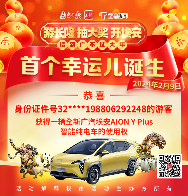 好人启好运,最暖是广东!2月9日19时许,由南方+、触电新闻主办的“请到广东过大年之游长隆、抽大奖、开埃安”活动开出首个大奖,随着全国道德模范赵广军在电脑前按下开奖键,身份证号为32****198806292248的游客获得一辆全新广汽埃安AION Y Plus智能纯电车的使用权。