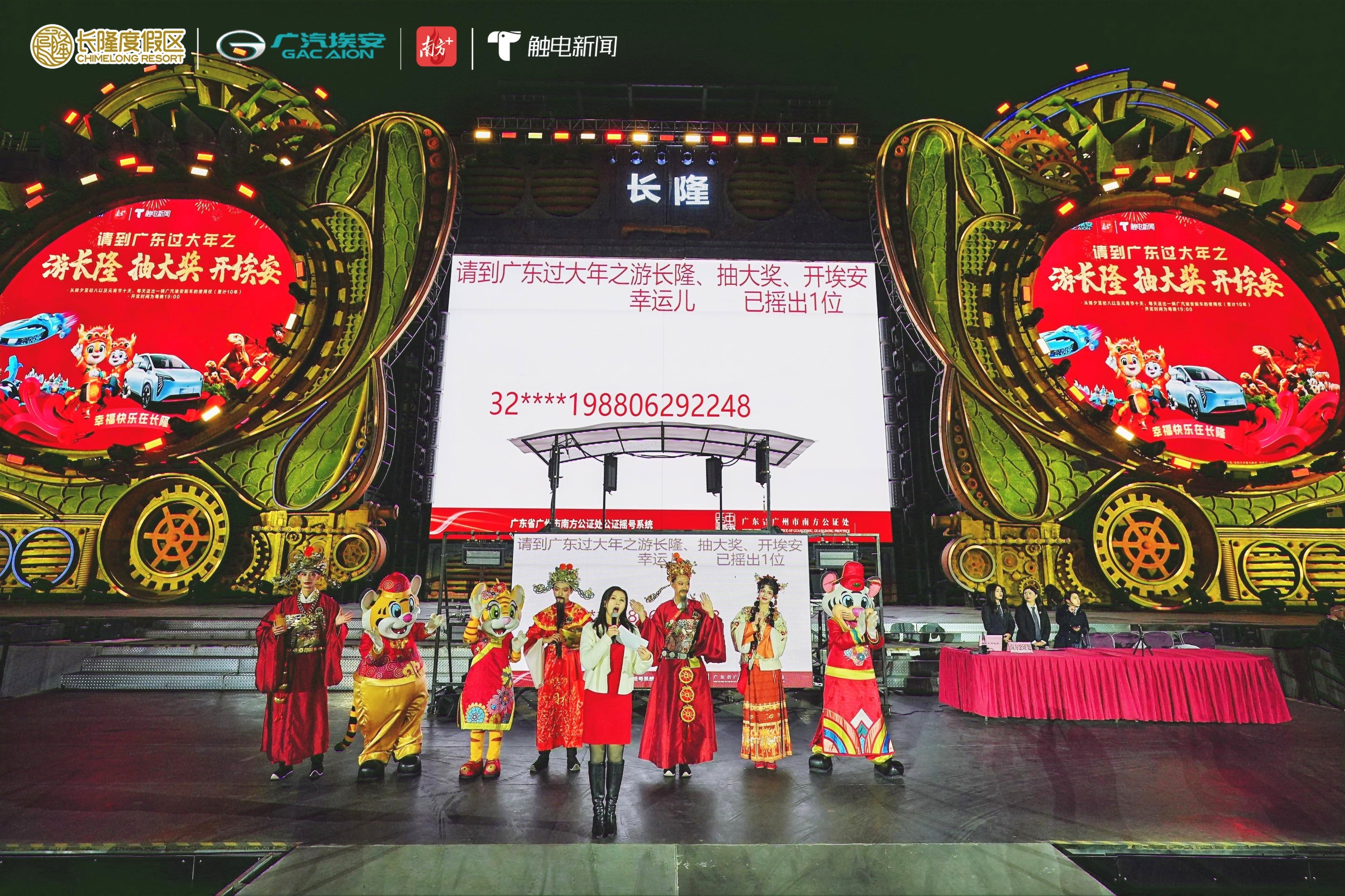 在长隆超级演艺广场,氛围更加热烈。“请到广东过大年之游长隆、抽大奖、开埃安”首场抽奖活动准备就绪。