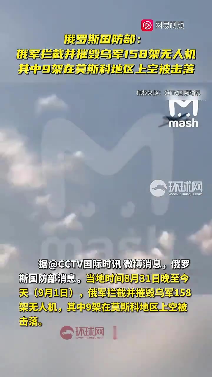 据俄罗斯国防部消息,当地时间8月31日晚至今天(9月1日),俄军拦截并摧毁乌军158架无人机,其中9架在莫斯科地区上空被击落。