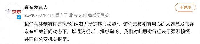 10月13日,@京东发言人 发文称,我们关注到有谣言称“刘姓商人涉嫌违法被抓”,该谣言被别有用心的人刻意发布在京东相关新闻动态下,以混淆视听、操纵舆论。我们对此恶劣行径表示强烈愤慨,并已向公安机关报案。 编辑 邓素凡 订阅后可查看全文(剩余80%)