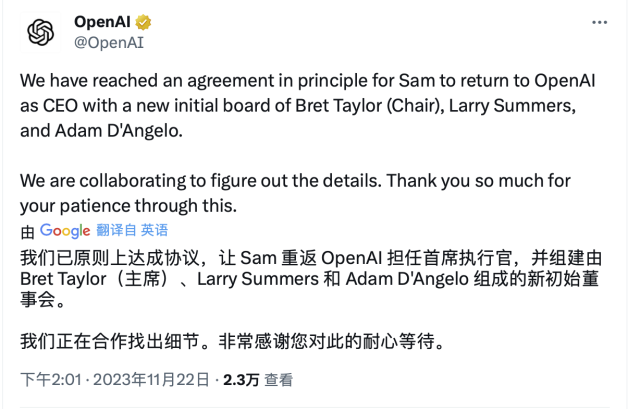 当地时间11月21日晚间,美国人工智能新锐巨头OpenAI宣布,已经原则上达成协议,山姆·奥特曼(Sam Altman)重返公司担任CEO,“并组建由董事会主席Bret Taylor、Larry Summers和Adam D'Angelo组成的新董事会。”详情>>