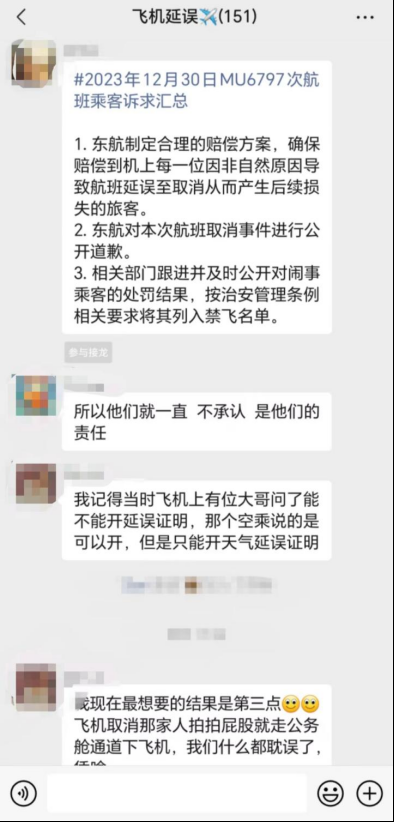 在“飞机延误”的群聊中,记者观察到,乘客们普遍认为,此次事件是因商务舱内乘客与机组的争执,导致飞机无法推出,错过起飞时间,从而让近300人在假期第一天滞留机场。乘客们提出:希望东航能对本次航班取消事件进行公开道歉,并且制定合理的赔偿方案。