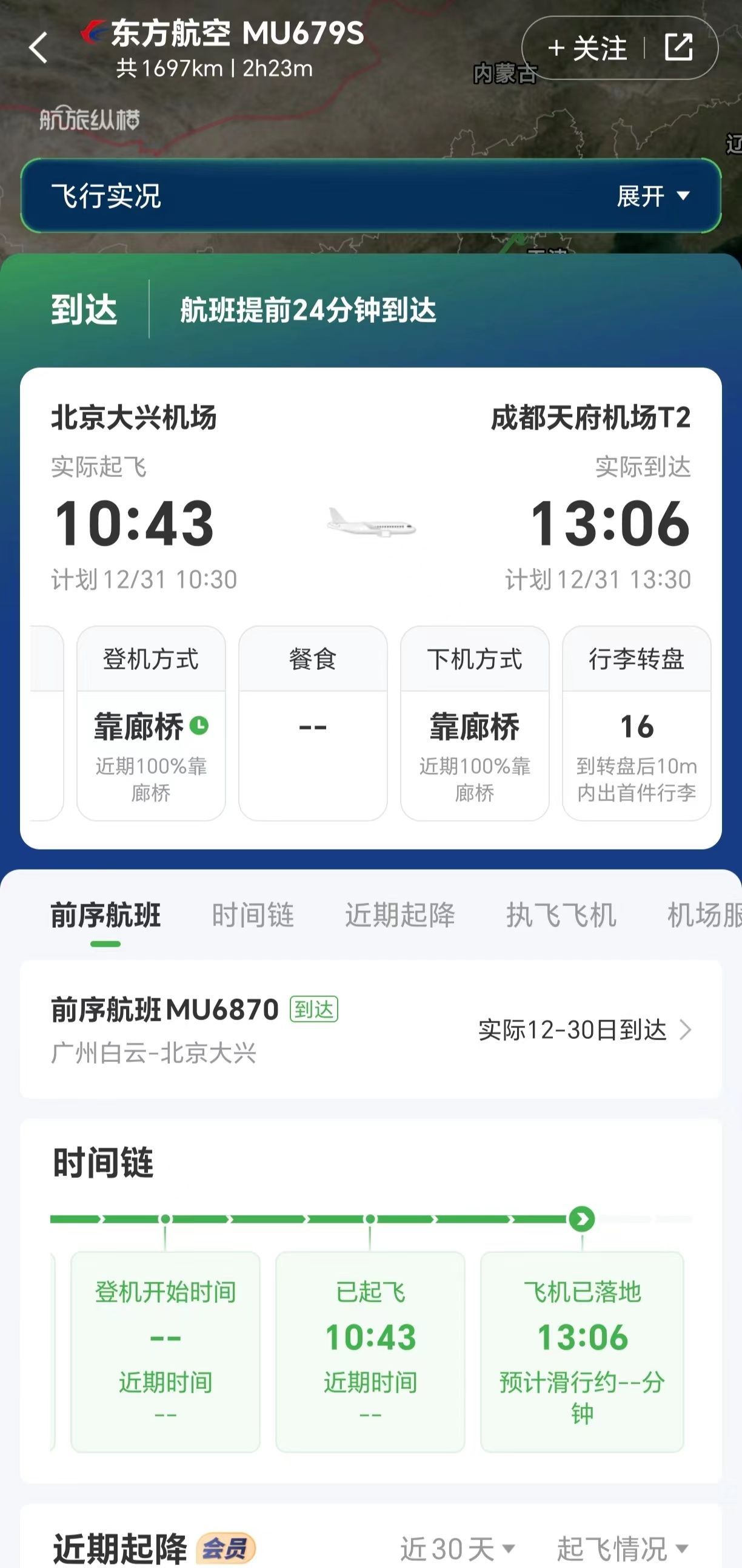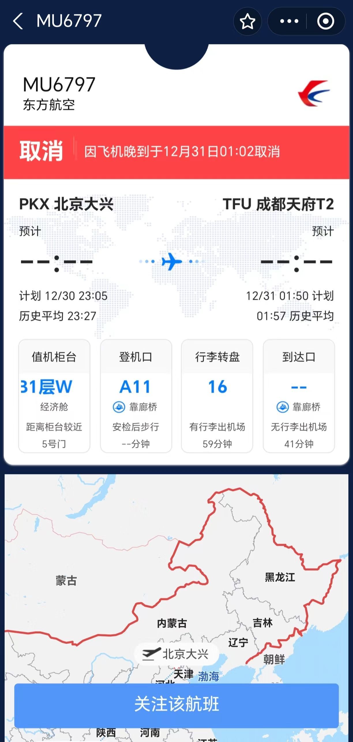 据“航旅纵横”“飞常准”App显示,该航班起初计划时间由18:00~20:45变更为23:05~01:50,最后因飞机晚到于12月31日01:02取消,由MU679S航班补班。MU679S的计划时间为12月31日10:30—13:30。