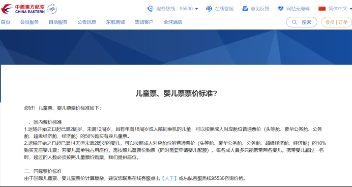 中国东方航空公司官网上有关婴儿旅客和儿童票、婴儿票的细则。