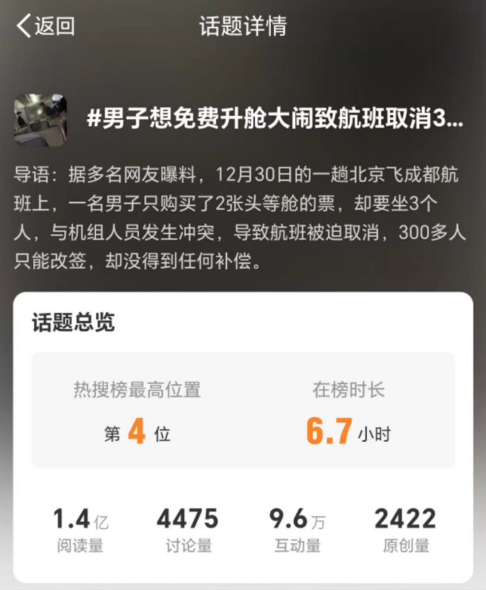 日前,社交媒体上一段视频引发关注。视频显示,2023年12月30日由北京飞往成都的MU6797次航班起飞前,一名商务舱的男乘客要求经济舱的育婴老师免费升舱到商务舱照顾孩子遭拒。男子因此在机舱内大闹2小时并报警,最终导致航班被迫取消。东方航空公司就此事回应读特记者:“航班是受天气影响取消。”1月5日,首都机场公安局发布通报,称对航班上涉事董某(男)作出行政拘留处罚。读特记者联系航班上的乘客,还原事发经过。