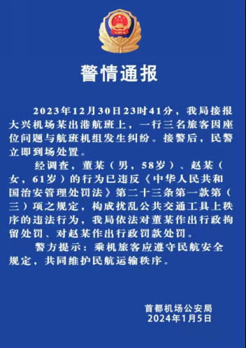 1月5日,首都机场公安局发布警情通报。通报显示,2023年12月30日23时41分,该局接报大兴机场某出港航班上,一行三名旅客因座位问题与航班机组发生纠纷。接警后,民警立即到场处置。经调查,董某(男,58岁)、赵某(女,61岁)的行为已违反《中华人民共和国治安管理处罚法》第二十三条第一款第(三)项之规定,构成扰乱公共交通工具上秩序的违法行为,我局依法对董某作出行政拘留处罚、对赵某作出行政罚款处罚。