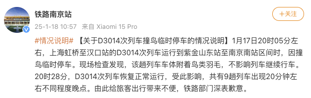 1月18日,@铁路南京站发布情况说明,1月17日20时05分左右,上海虹桥至汉口站的D3014次列车运行到紫金山东站至南京南站区间时,因撞鸟临时停车。现场检查发现,该趟列车车体附着鸟类羽毛,不影响列车继续行车。20时28分,D3014次列车恢复正常运行,受此影响,共有9趟列车出现20分钟左右不同程度晚点。由此给旅客出行带来不便,铁路部门深表歉意。
